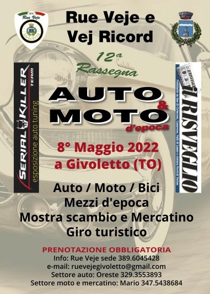 Domenica 8 Maggio dalle ore 8.00 presso Piazza della Concordia, si terrà la dodicesima rassegna d'atto e moto d'epoca.