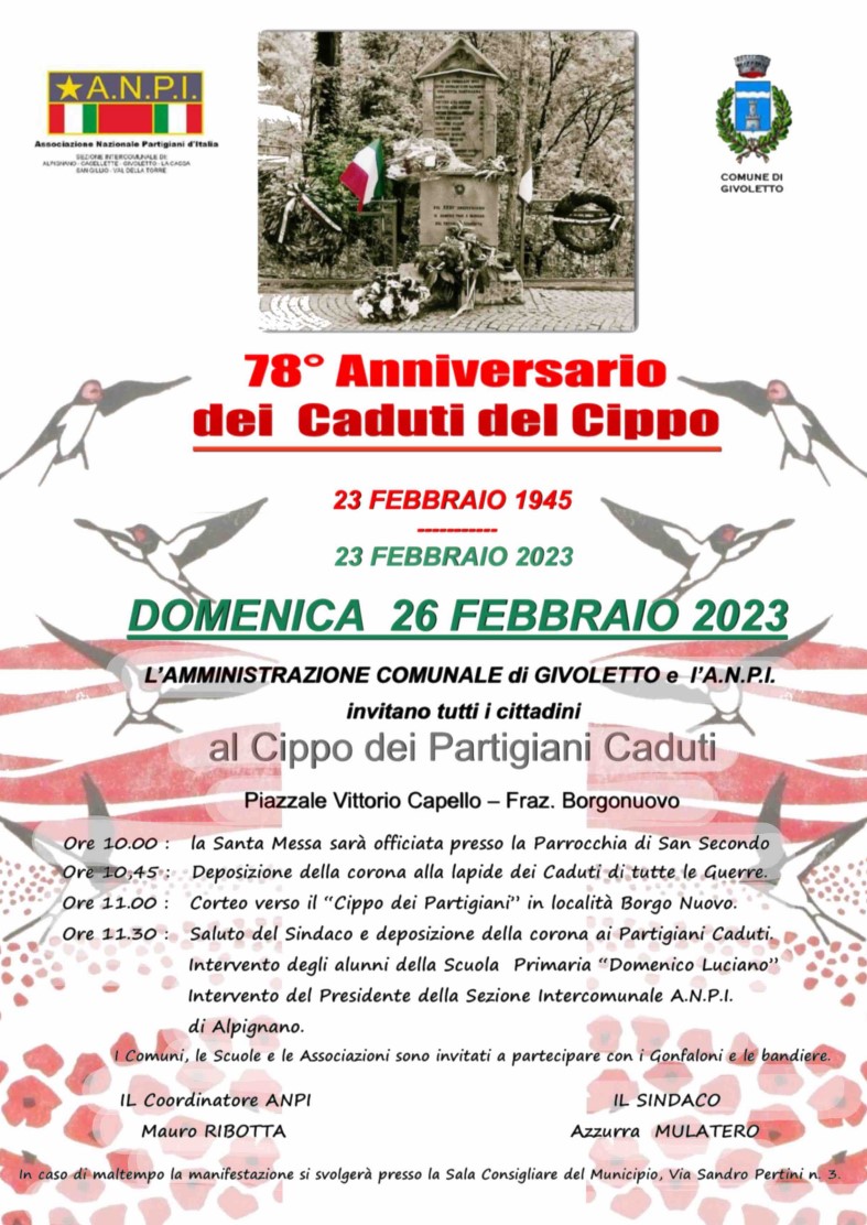 Il Sindaco e l'Amministrazione Comunale, in collaborazione con l'A.N.P.I., invitano tutta la cittadinanza a partecipare alla cerimonia commemorativa per il 78º anniversario dei caduti al cippo.