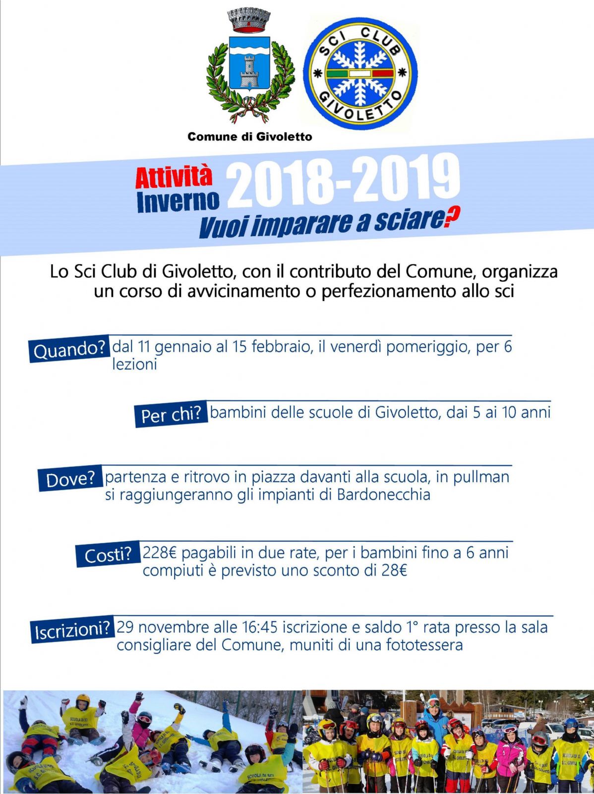 Lo Sci Club Givoletto, con il contributo del Comune, organizza un corso di avvicinamento o perfezionamento allo sci indirizzato ai bambini delle scuole di Givoletto dai 5 ai 10 anni.