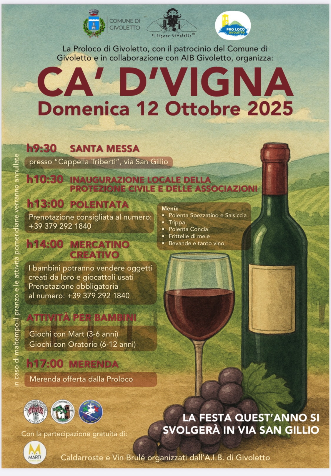 Domenica 12 Ottobre, con la messa e l’inaugurazione del nuovo locale di protezione civile e associazioni di Via San Gillio, appuntamento con la tradizionale festa di Ca' d' Vigna, che quest’anno si terrà in Via San Gillio.