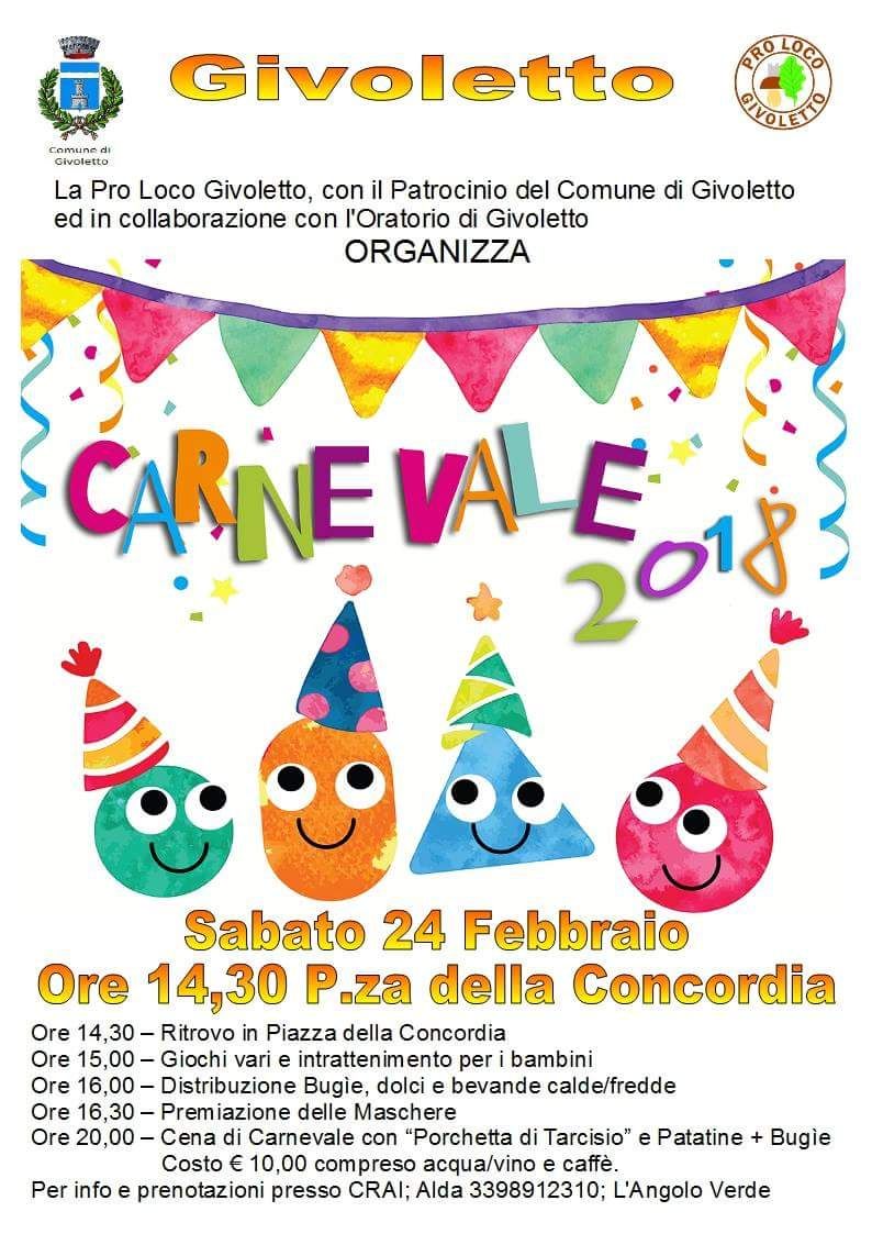 Sabato 24 febbraio dalle ore 14.30 presso il Salone Polivalente e Piazza della Concordia, la Proloco Givoletto in collaborazione con Oratorio Givoletto e con Patrocinio del Comune di Givoletto, invita tutti al Carnevale 2018. Il pomeriggio si svolgerà con intrattenimento per i bambini, premiazione delle maschere e distribuzione bugie, dolci e bevande per tutti. L'evento si terrà anche in caso di maltempo.