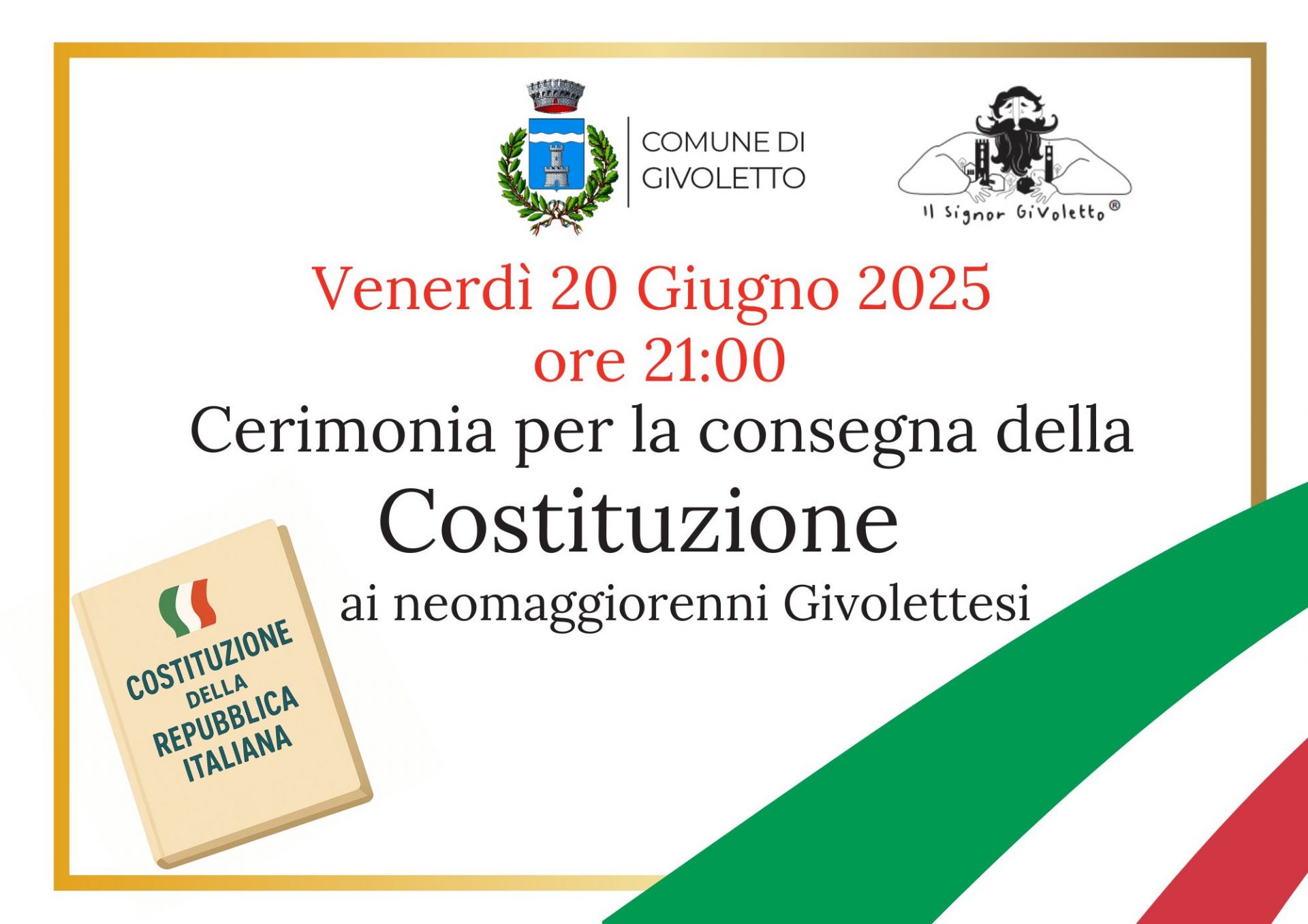 Nella prima serata dell'evento E..state a Givoletto, alle ore 21.00 del 20 Giugno, verrà consegnata ai maggiorenni givolettesi nell'anno 2025, copia della Costituzione della Repubblica Italiana. Un momento importante per i ragazzi che hanno raggiunto la maggiore età.