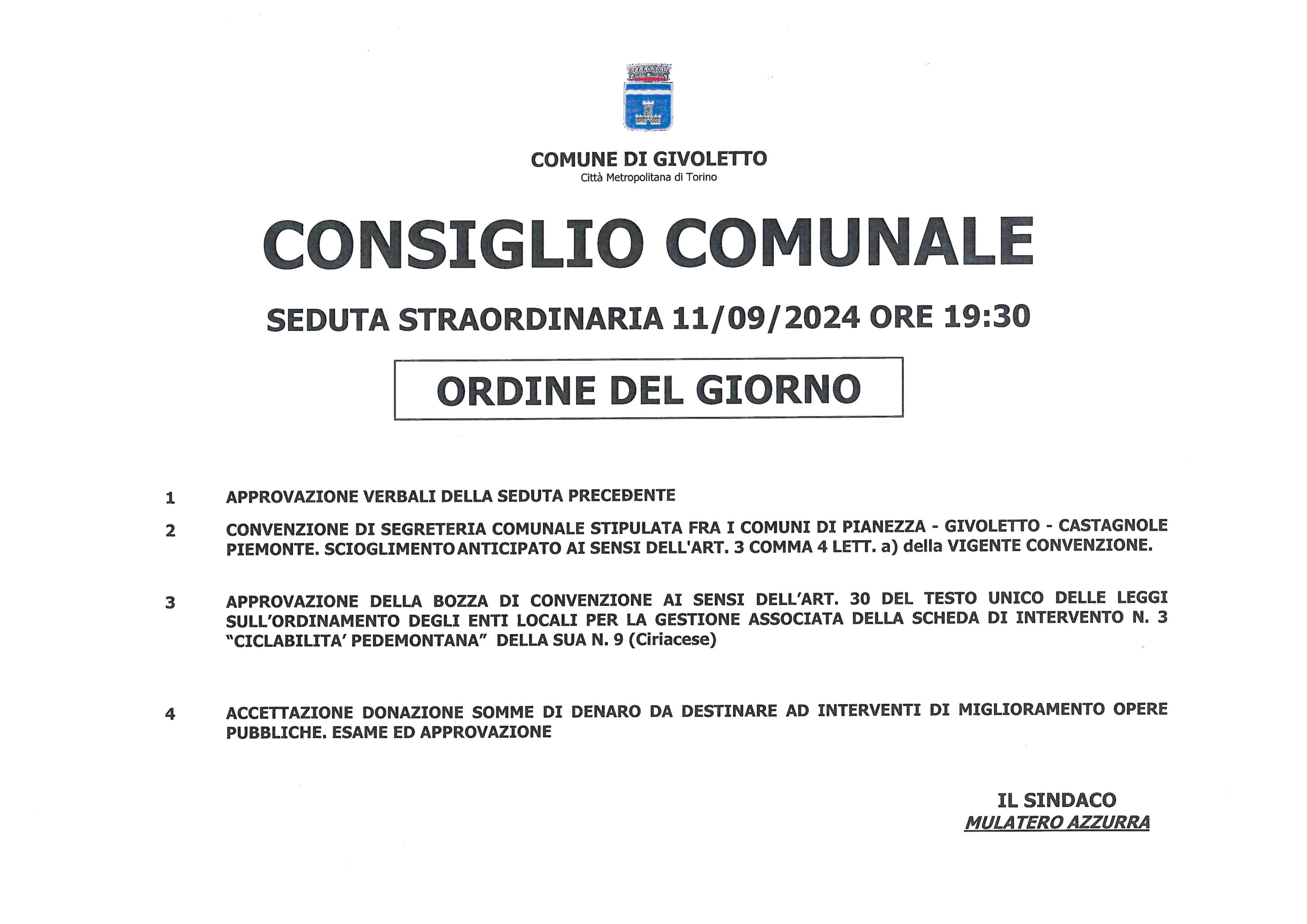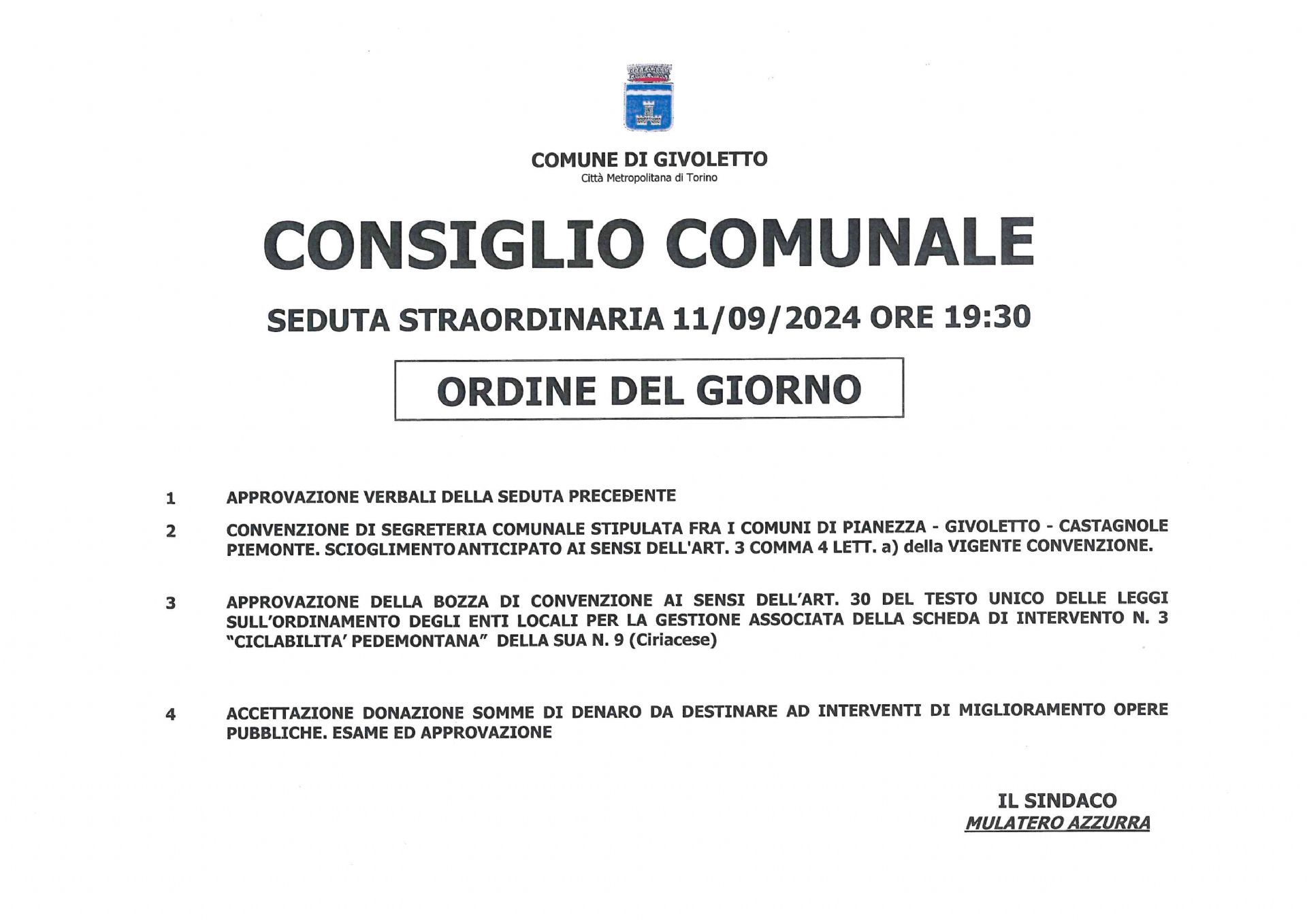 E' stato convocato il Consiglio Comunale in seduta straordinaria per il giorno 11/09/2024 alle ore 19:30 presso la Sala Consigliare