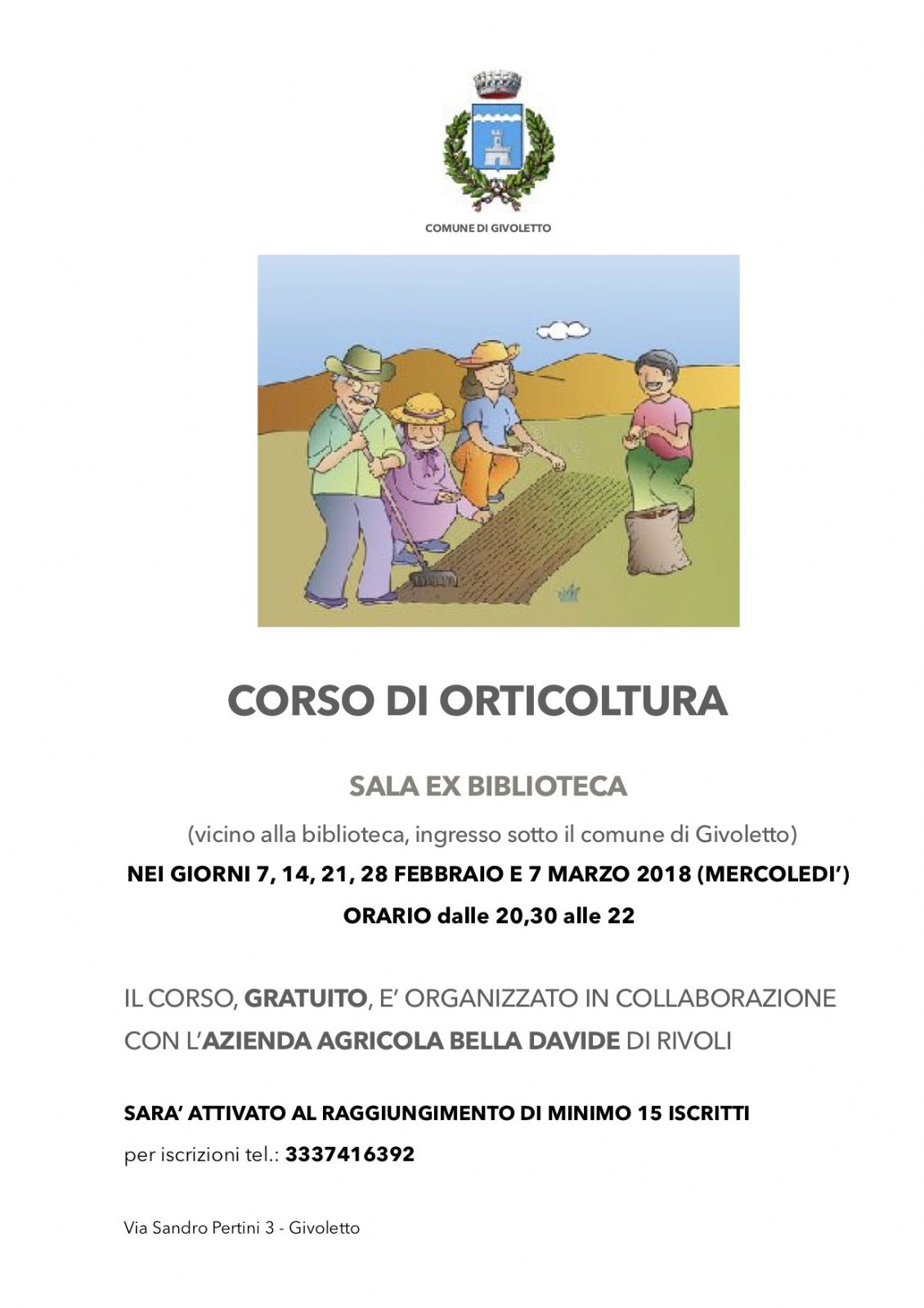 Presso i locali della ex biblioteca del Comune di Givoletto nei giorni 7-14-21-28 Febbraio e 7 Marzo, con inizio alle ore 20.30, si terrà un corso gratuito di orticoltura. Il corso, in collaborazione con l'Azienda Agricola Bella Davide, sarà attivato al raggiungimento di minimo 15 iscritti.