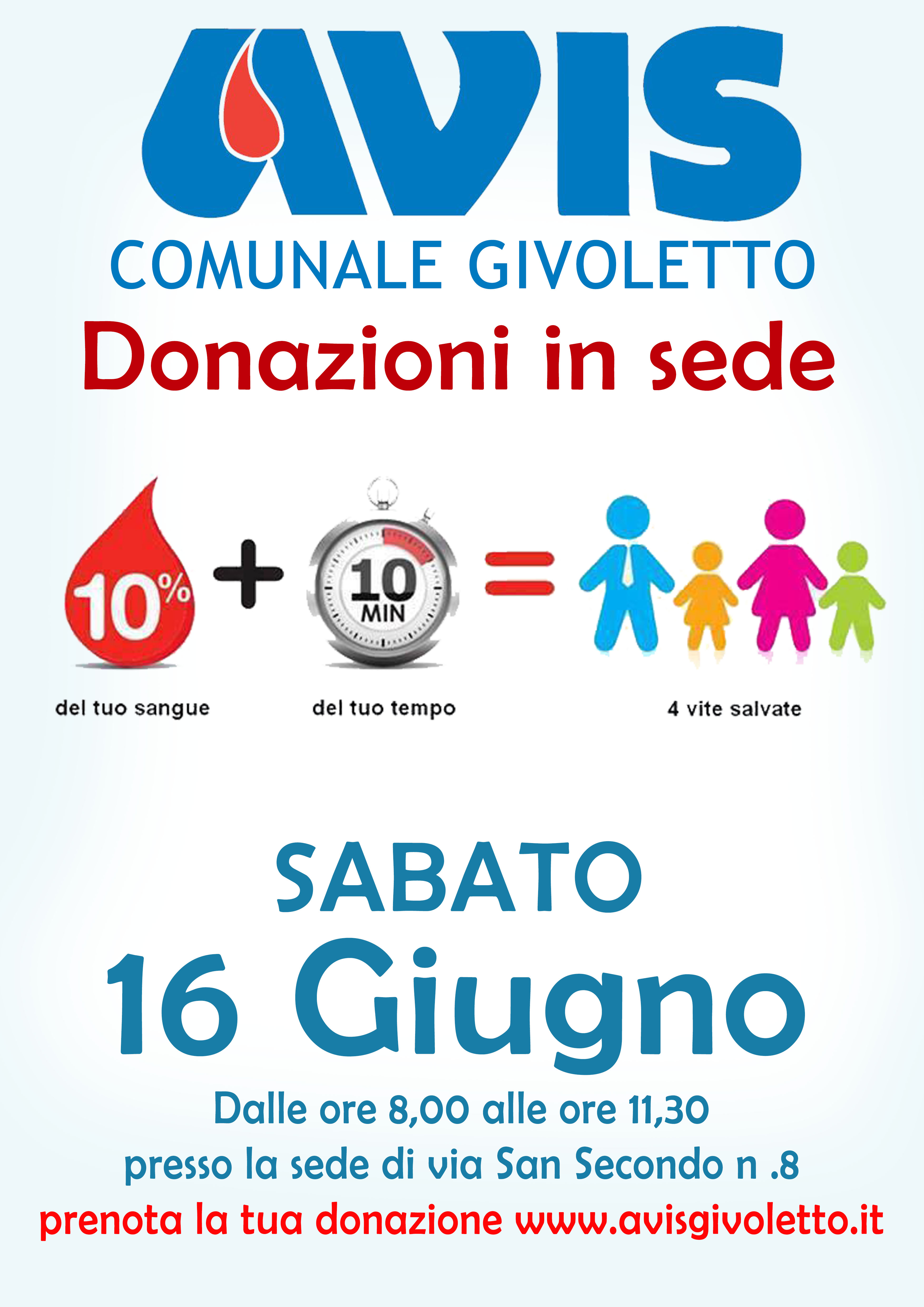 Sabato 16 Giugno dalle ore 8.00 alle ore 11.30 presso la sede Avis Givoletto, Via San Secondo 8, chi vuole può partecipare con una donazione alla raccolta sangue. Il 10% del tuo sangue e 10 minuti del tuo tempo, possono salvare 4 vite!!