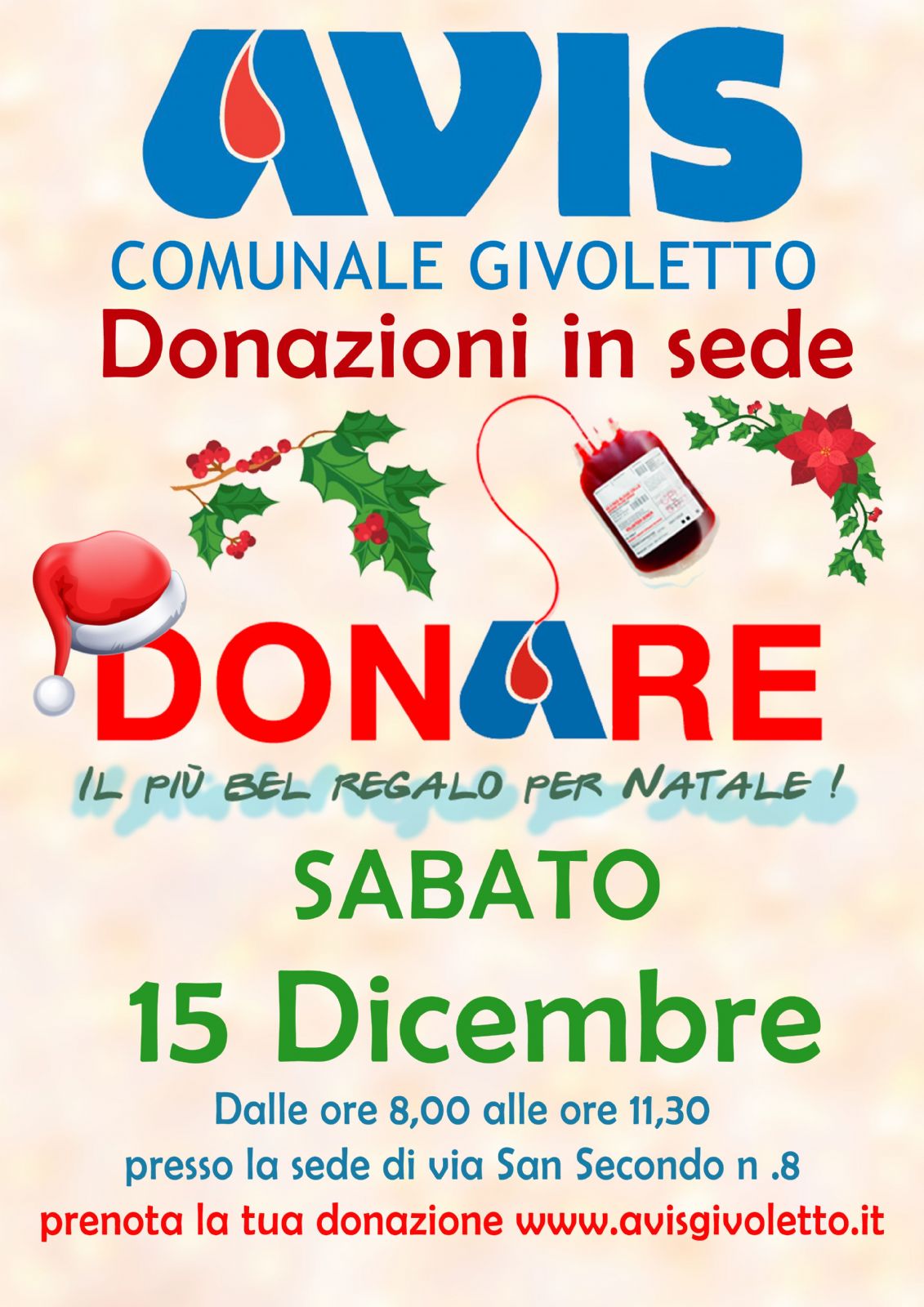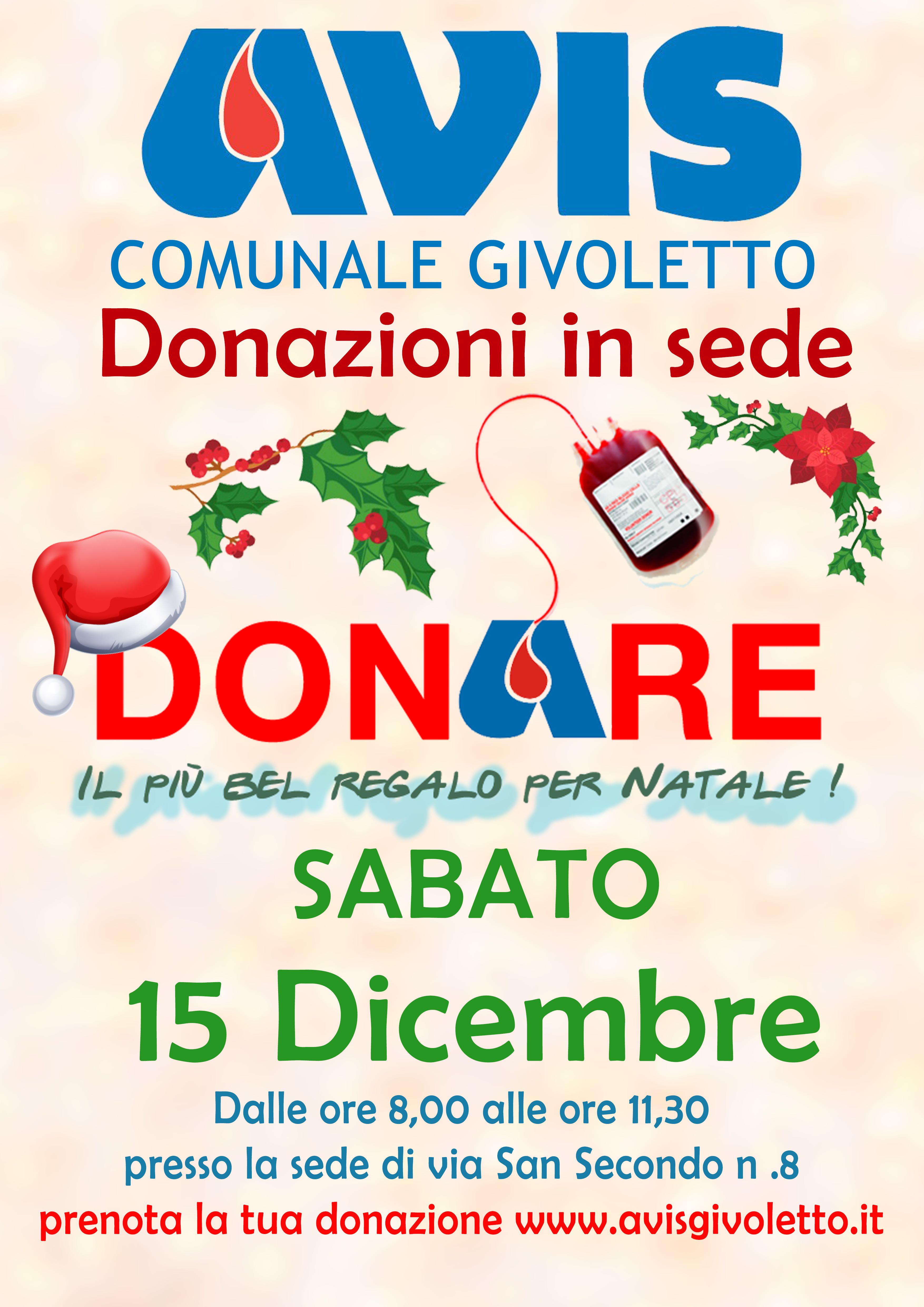 Sabato 15 Dicembre dalle ore 8.00 alle ore 11.30 presso la sede Avis di Givoletto, Via San Secondo 8, chi vuole può partecipare con una donazione alla raccolta sangue. Vi è anche la possibilità di prenotare la donazione sul sito Avis Givoletto al link www.avisgivoletto.it