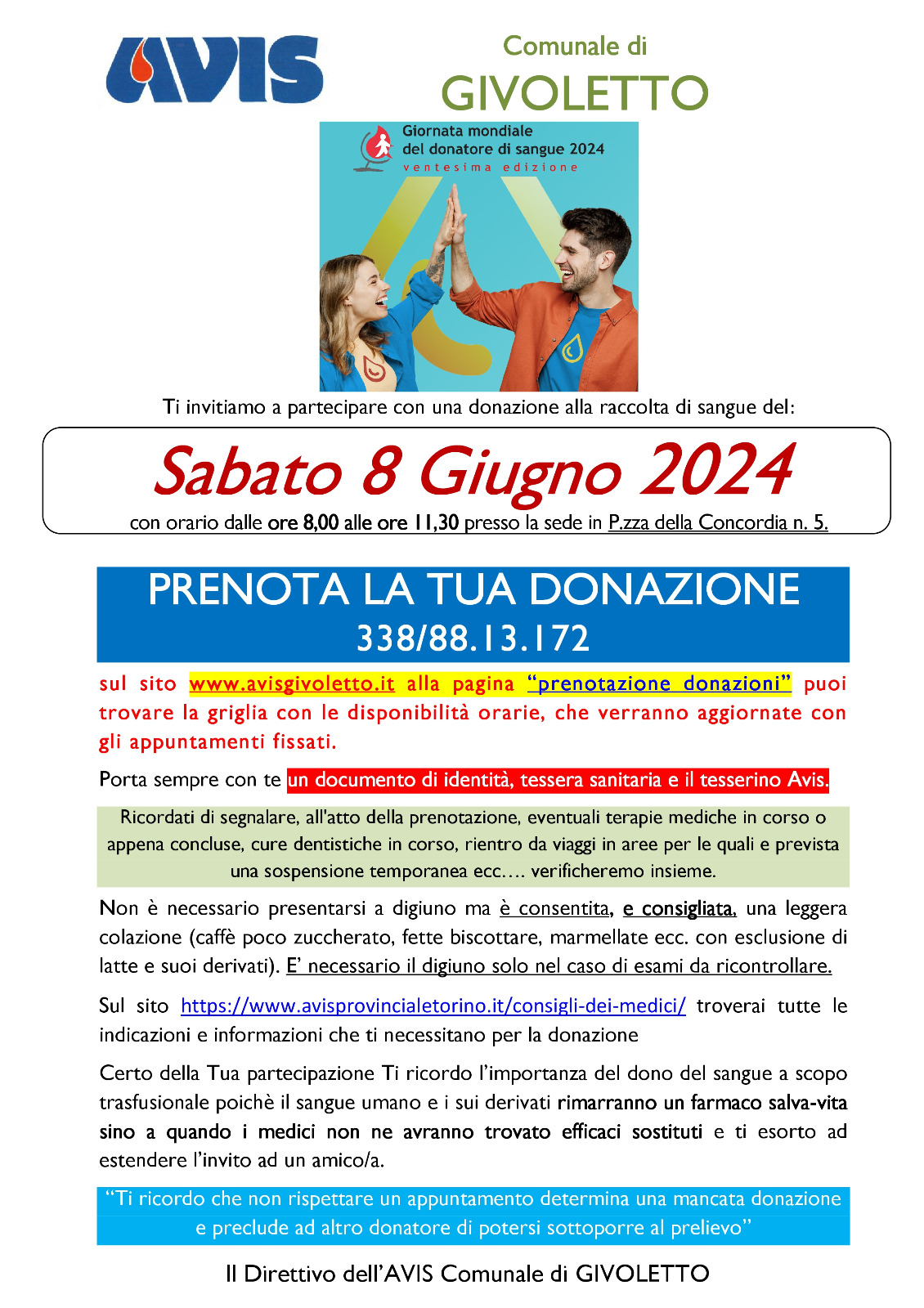 Sabato 08 Giugno dalle ore 8.00 alle ore 11.30 presso la sede Avis Givoletto, Piazza della Concordia 5, chi volesse può partecipare con una donazione alla raccolta sangue. Vi è anche la possibilità di prenotare la donazione attraverso il link: Avis Givoletto