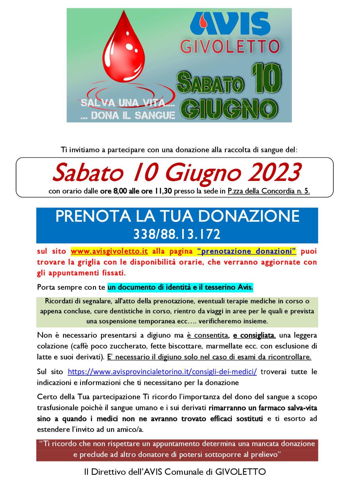Sabato 10 Giugno dalle ore 8.00 alle ore 11.30 presso la sede Avis Givoletto, Piazza della Concordia 5, chi vuole può partecipare con una donazione alla raccolta sangue. Vi è anche la possibilità di prenotare la donazione attraverso il link: Avis Givoletto