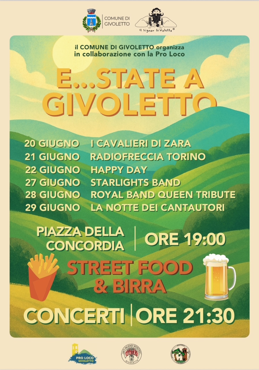 Questa importante iniziativa, organizzata dal Comune in collaborazione con la Proloco, Aib Givoletto e Oratorio Givoletto - La Cassa, vedrà suonare sul palco di Piazza della Concordia: