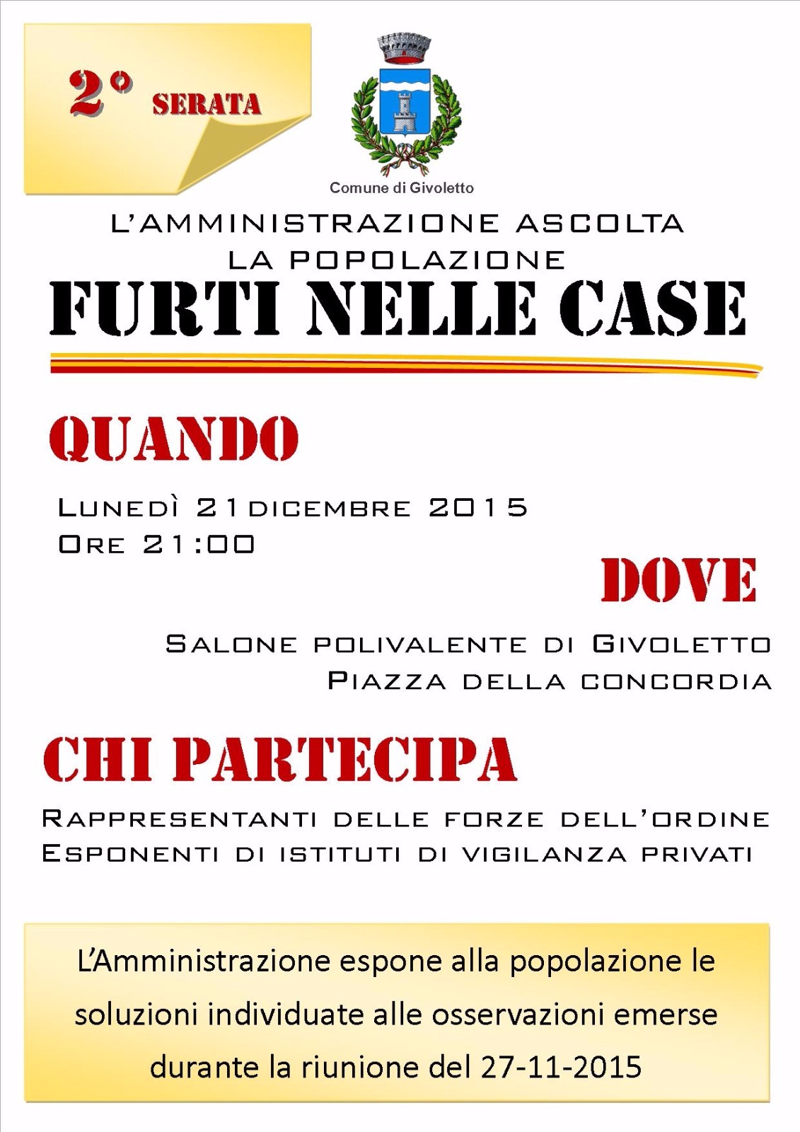L'Amministrazione espone alla popolazione le soluzioni individuate alle osservazioni emerse durante la riunione del 27-11-2015.