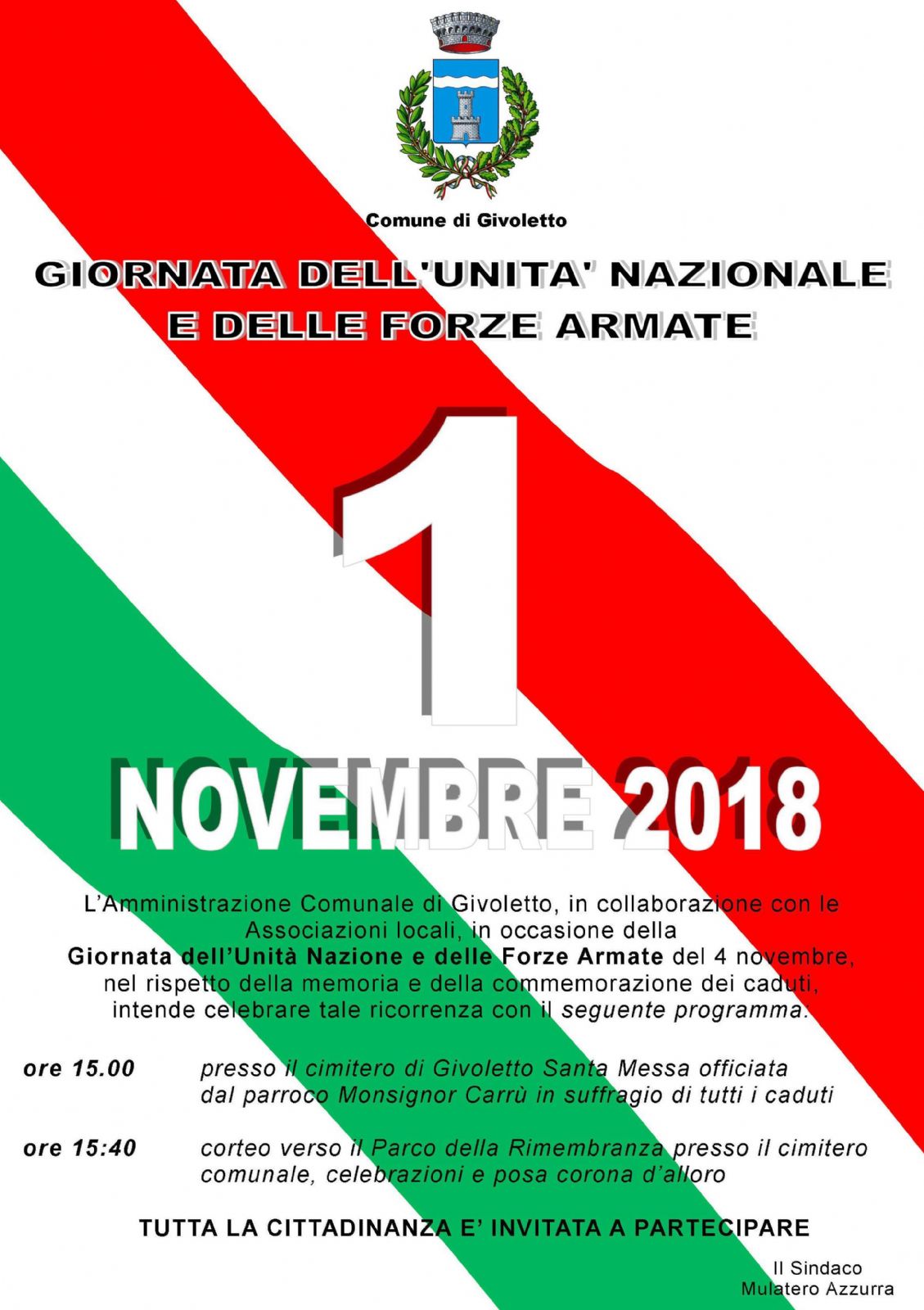 L'Amministrazione Comunale di Givoletto, in collaborazione con le Associazioni locali, in occasione della Giornata dell'Unità Nazionale e delle Forze Armate del 4 Novembre, nel rispetto della memoria e della commemorazione dei caduti, intende celebrare tale ricorrenza. Tutta la cittadinanza è invitata a partecipare.