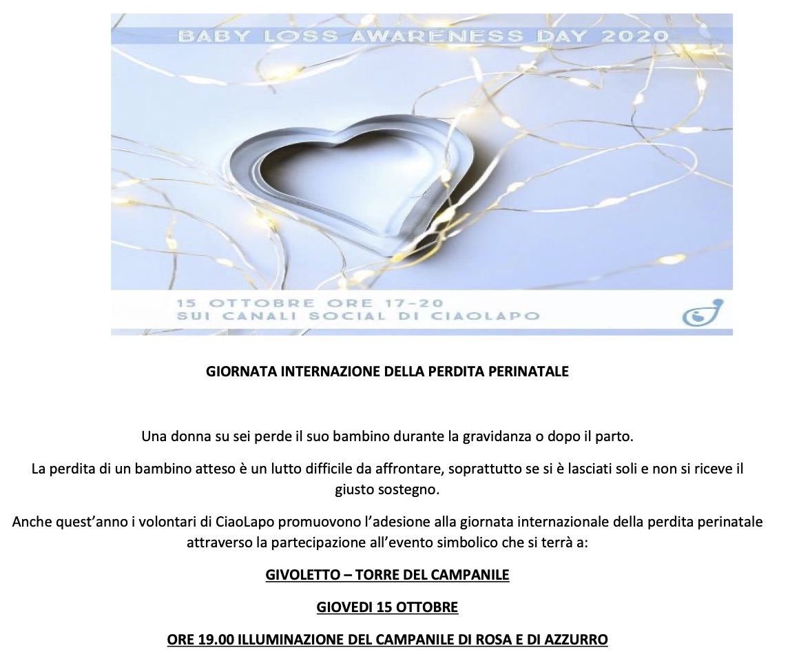 L'Associazione CiaoLapo con il Patrocinio del Comune di Givoletto, promuove la "Giornata internazionale della consapevolezza sul lutto perinatale" che si terrà giovedì 15 Ottobre 2020.