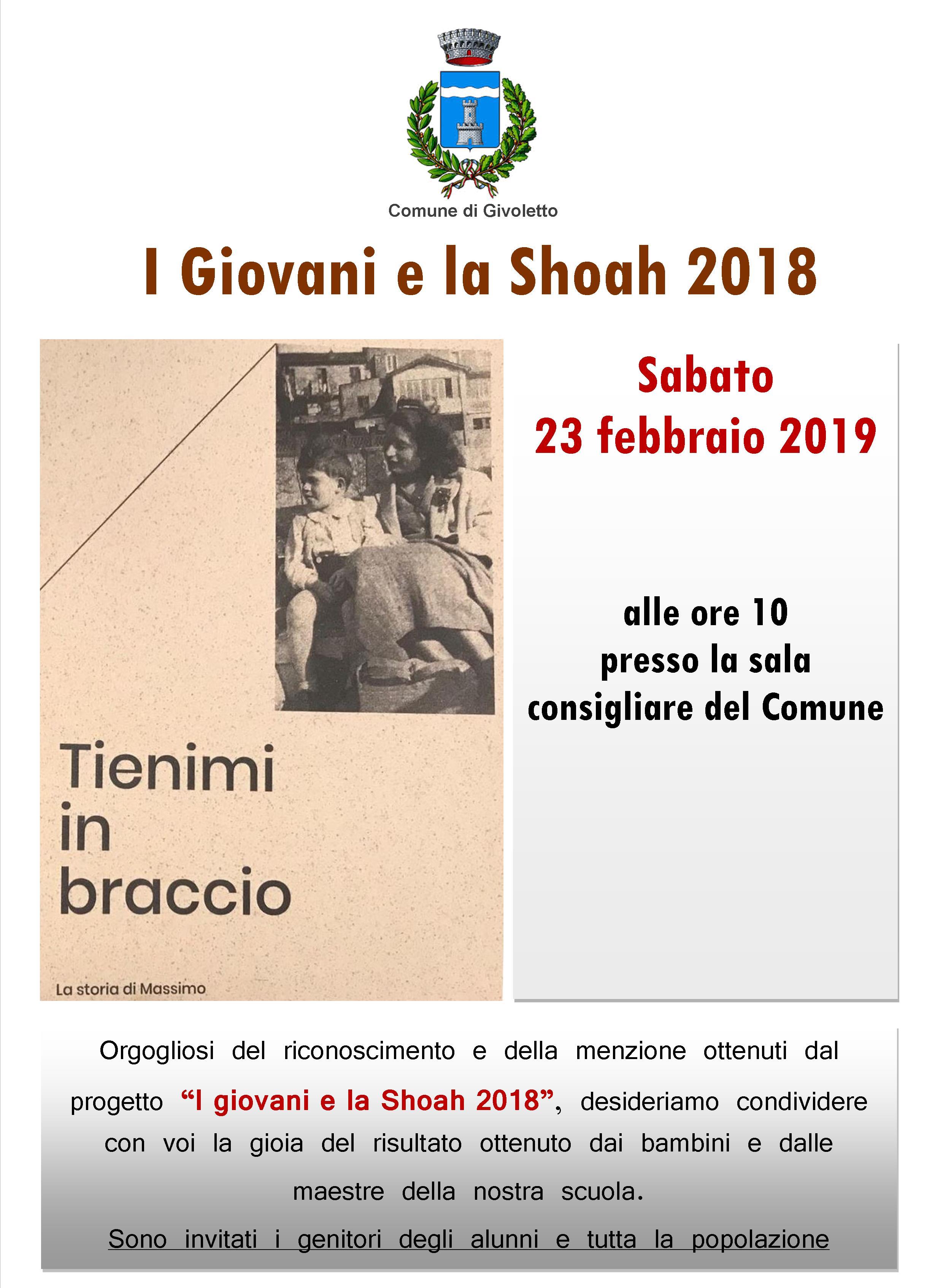 Orgogliosi del riconoscimento e della menzione ottenuti dal progetto "I giovani ricordano la Shoah 2018", desideriamo condividere con Voi la gioia del risultato ottenuto dai bambini e dalle maestre della nostra scuola. Sono invitati i genitori degli alunni e tutta la popolazione, Sabato 23 Febbraio alle ore 10 presso la Sala Consiliare del Comune di Givoletto.