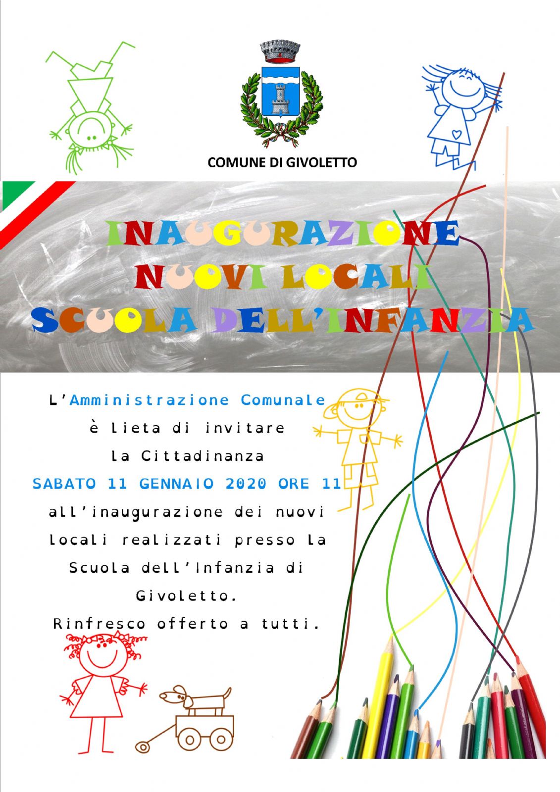Sabato 11 Gennaio 2020 alle ore 11, l'Amministrazione Comunale è lieta di invitare tutti i cittadini all'inaugurazione dei nuovi locali realizzati presso la Scuola dell'Infanzia di Givoletto.
