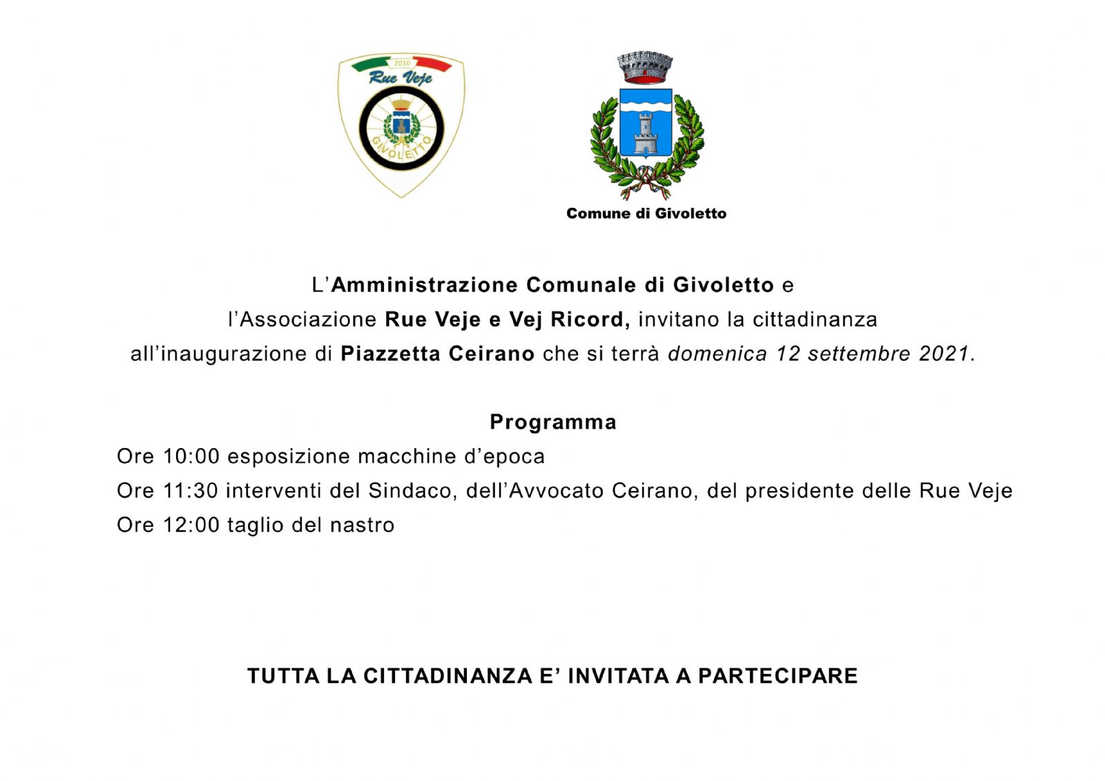 L'Amministrazione Comunale di Givoletto in collaborazione con l'Associazione Rue Veje e Vej Ricord, invitano la cittadinanza all'inaugurazione della Piazza Ceirano che si terrà domenica 12 Settembre 2021.