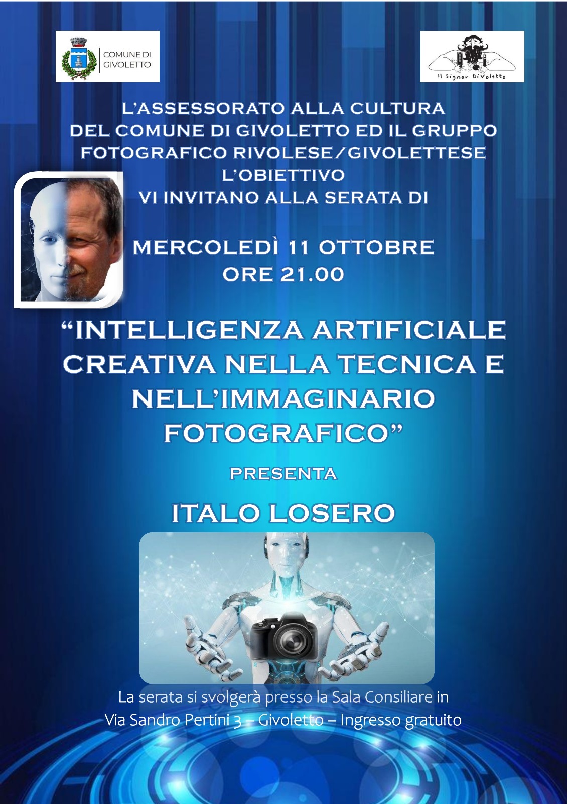 Mercoledì 11 Ottobre alle ore 21.00 presso la sala consiliare del Comune di Givoletto con ingresso libero, l'assessorato alla cultura del Comune con il gruppo fotografico Rivolese/Givolettese presentano una serata dedicata all'intelligenza artificiale applicata alla tecnica e all'immaginario fotografico. Serata presentata da Italo Losera.