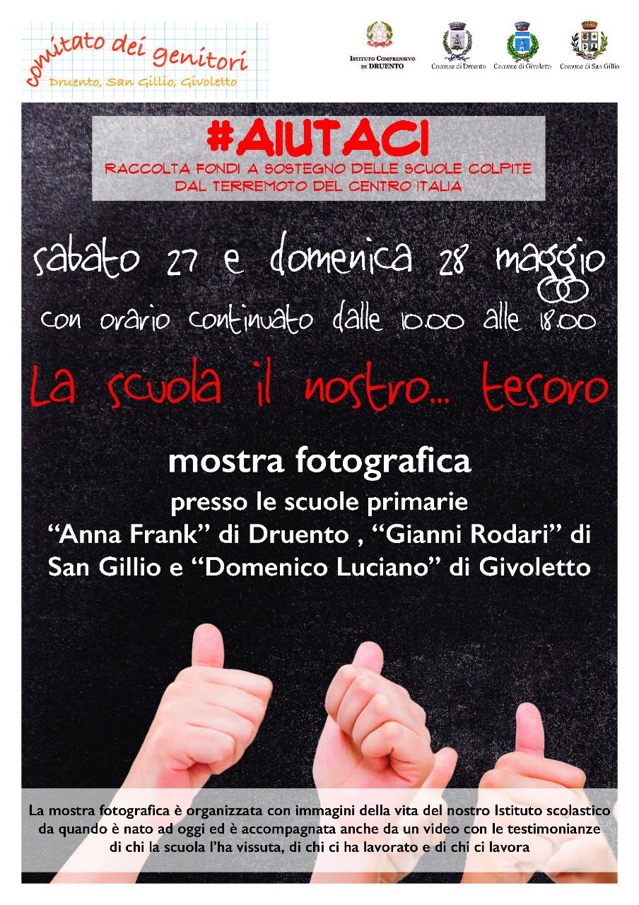Con orario continuato dallo 10.00 alle 18.00 presso le scuole primarie "Anna Frank" di Druento, "Gianni Rodari" di San Gillio e "Domenico Luciani" di Givoletto, sabato 27 e domenica 28 Maggio, si terrà una mostra fotografica con immagini del nostro Istituto scolastico da quando è nato ad oggi.