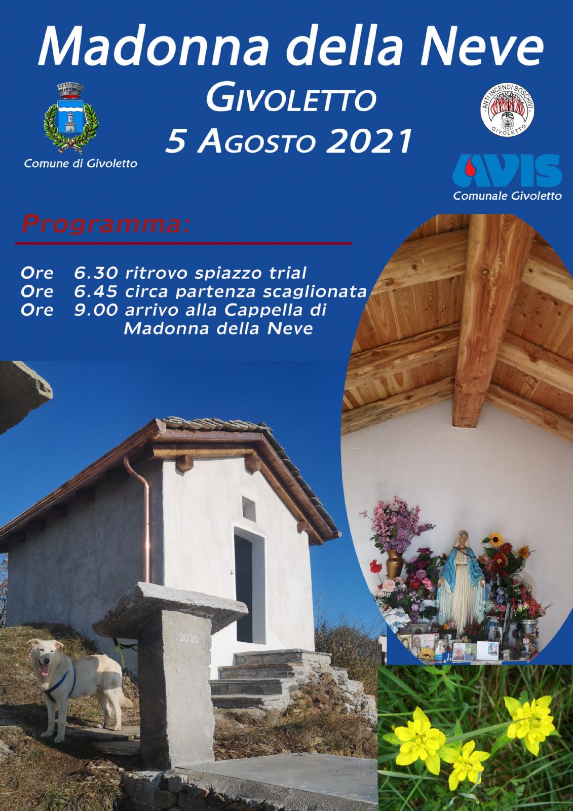 Anche quest’anno siete tutti invitati alla cappella della Madonna della Neve in occasione della festa del 5 Agosto. Sul volantino è indicato il programma con gli orari. In caso di pioggia o mal tempo, l’escursione non avrà luogo.