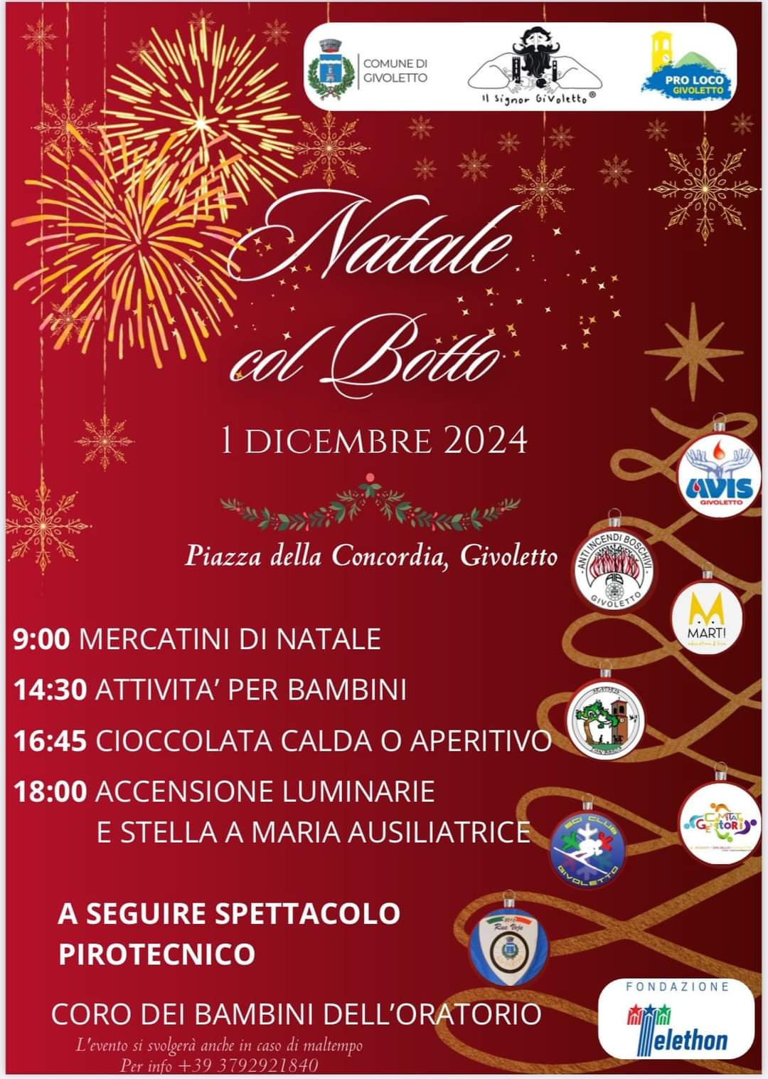 Alle 18, dopo il Coro dell’Oratorio, accensione delle luminarie e dell’albero di natale e subito dopo, spettacolo pirotecnico a cura del Comune.