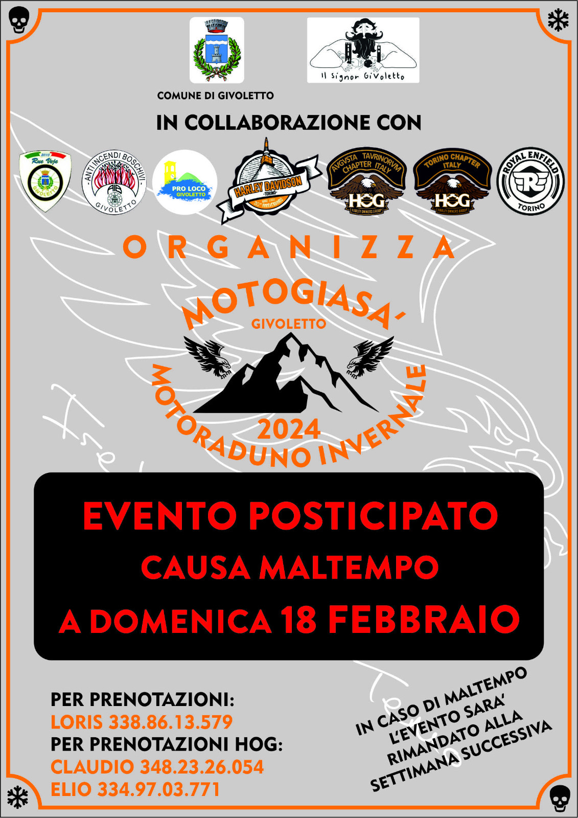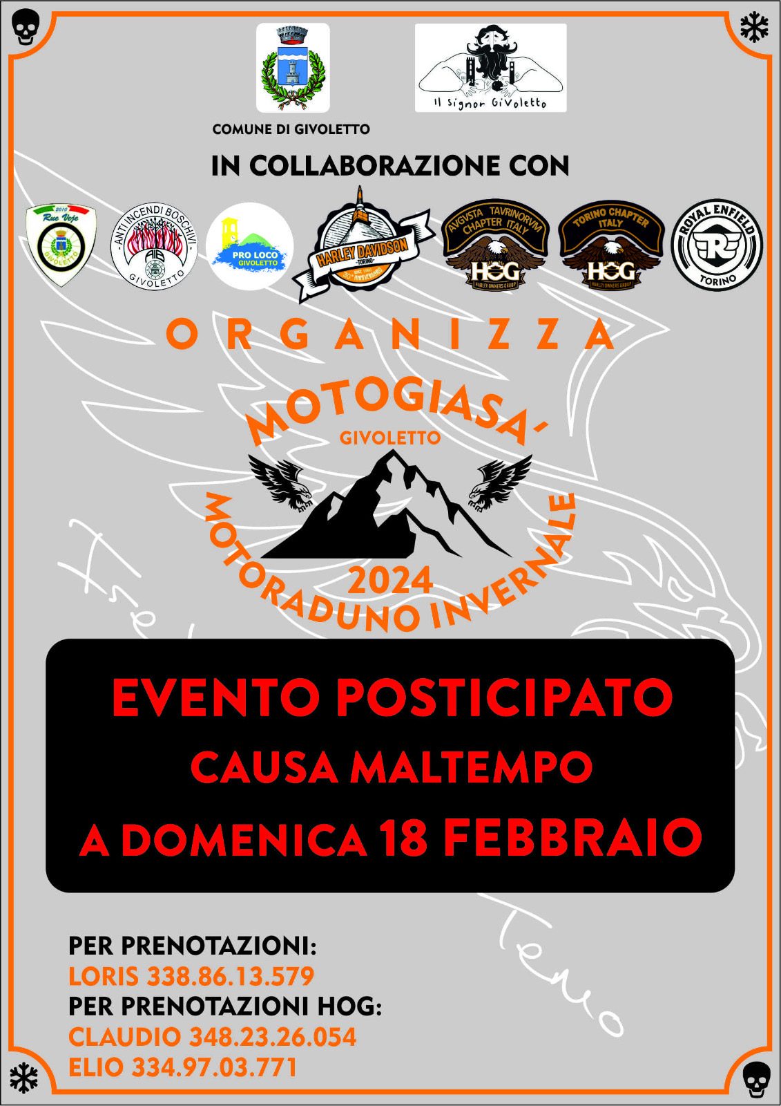 Domenica 18 Febbraio appuntamento con la seconda edizione della Motogiasà a Givoletto. L'evento vuole riunire tutti i motociclisti e gli appassionati di moto, incontrandosi in Piazza della Concordia per poi partire per un moto giro nei dintorni di Givoletto e al rientro, pranzo tutti insieme!