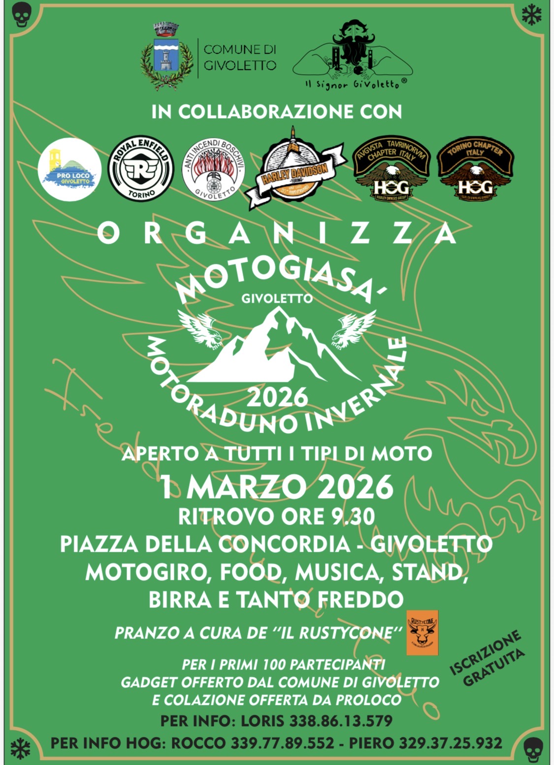 Domenica 1 Marzo appuntamento con la quarta edizione della Motogiasà a Givoletto. L'evento vuole riunire tutti i motociclisti e gli appassionati di moto, incontrandosi in piazza della Concordia per poi partire per un moto giro nei dintorni di Givoletto e al rientro, pranzo tutti insieme.