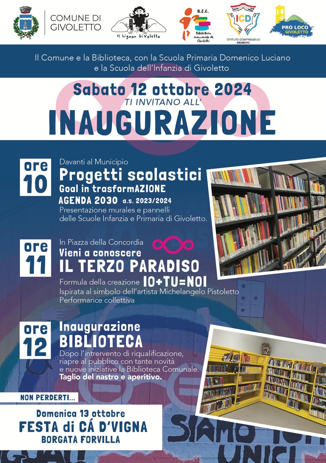 Sabato 12 Ottobre appuntamento alle ore 10.00 con ritrovo in Piazza Concordia per l’inaugurazione dei progetti scolastici della scuola primaria “Goal in trasformAZIONE” e successivamente alle ore 12.00 inaugurazione della biblioteca Comunale riqualificata.