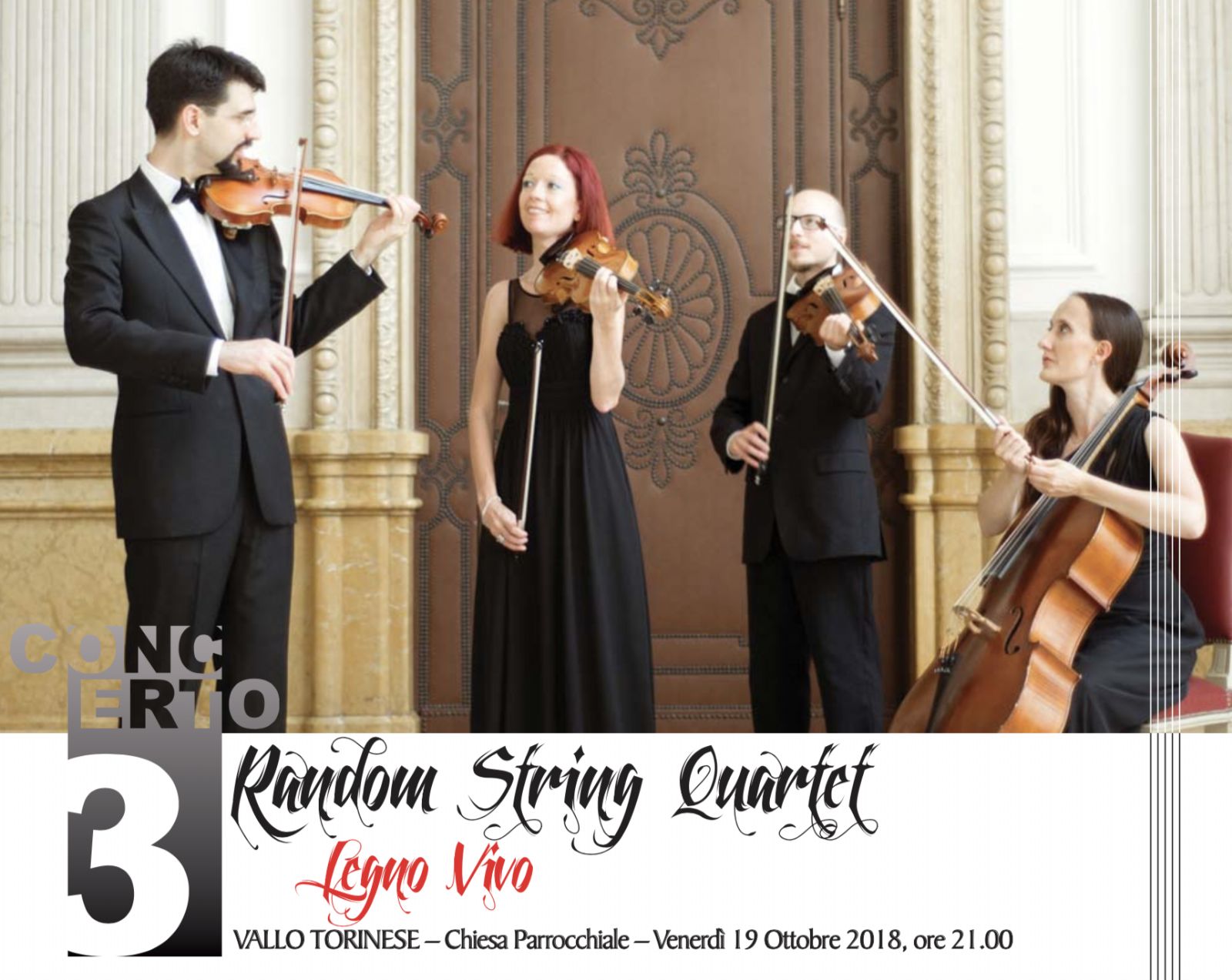 Venerdi 19 Ottobre presso la Chiesa Parrocchiale di Vallo Torinese alle ore 21.00, avrà luogo il terzo concerto della stagione Autunno-Inverno 2018. Il "Random Quartet", proporrà brani popolari in "Legno Vivo", partendo da alcuni capisaldi del quartetto classico ispirati alle musiche popolari, arrivando fino agli accenti vividi del folk irlandese e le melodie intense si quello scandinavo.