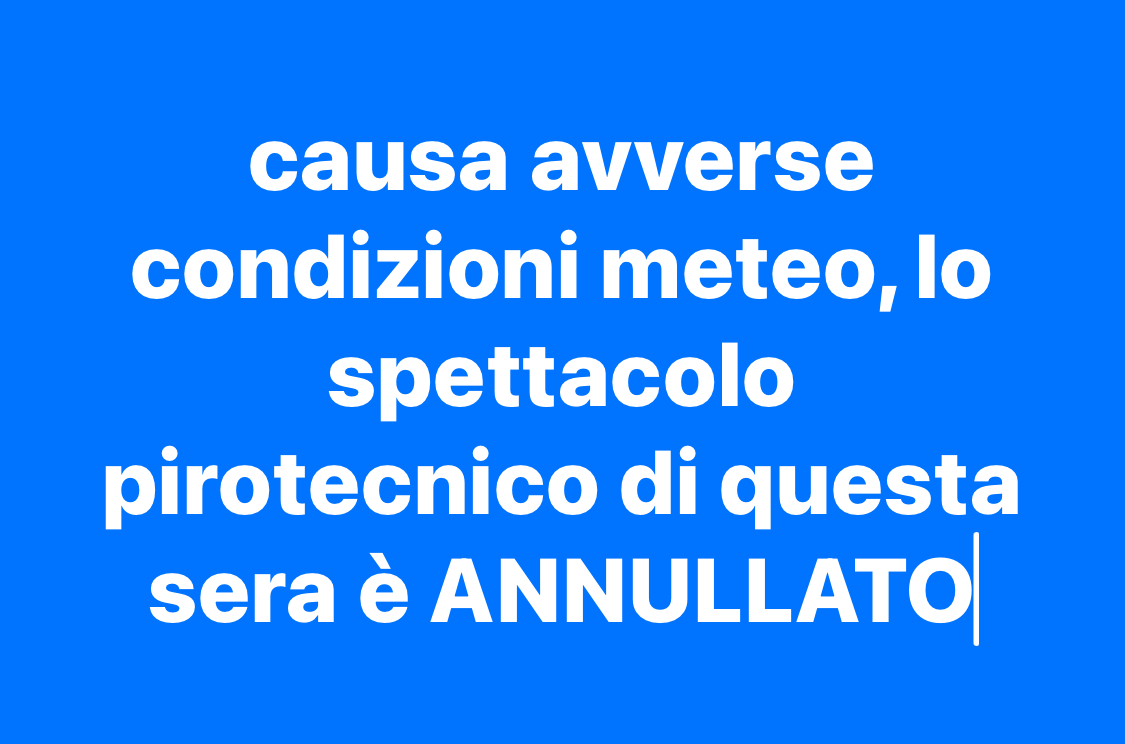 A causa delle avverse condizioni meteo, lo spettacolo pirotecnico di questa sera è ANNULLATO.