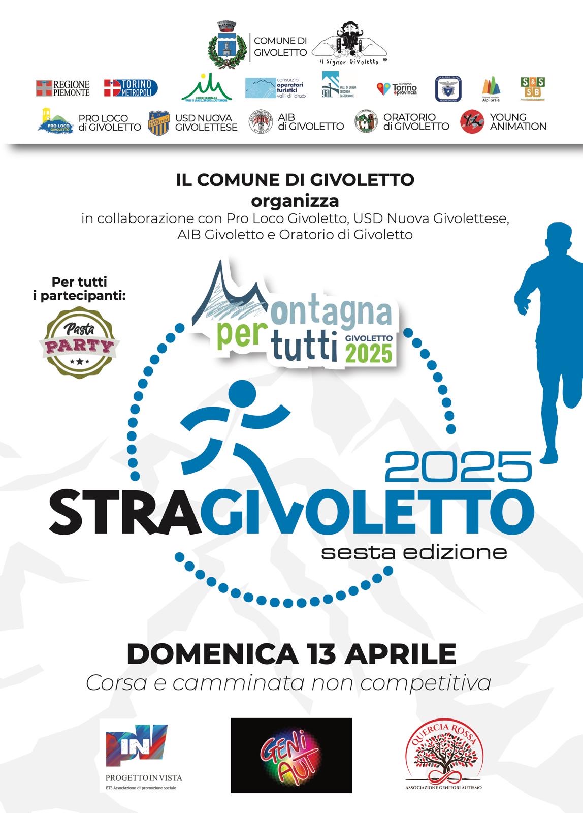 Con il sostegno di Regione Piemonte, Unione montana Valli di Lanzo, Ceronda e Casternone, Consorzio turistico delle Valli di Lanzo, GAL Valli di Lanzo, Ceronda e Casternone, Turismo Torino e Provincia, le associazioni del territorio Pro Loco Givoletto, USD Nuova Givolettese, AIB Givoletto, Oratorio Givoletto, Young Animation e le associazioni Progetto In Vista, GeniAut e Quercia Rossa Autismo, abbiamo nuovamente organizzato questa manifestazione non competitiva con l’obiettivo di promuovere il diritto delle persone disabili ad essere inserite in ogni ambito della vita sociale senza pregiudizi o condizionamenti.