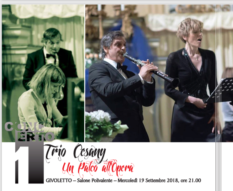 Mercoledì 19 Settembre presso il Salone Polivalente di Givoletto alle ore 21.00 avrà luogo il concerto inaugurale della stagione concertistica Autunno-Inverno 2018. Il Trio Cesany presenterà - Un palco all'opera - con l'intento di coinvolgere lo spettatore in un viaggio sonoro, attraverso le melodie e le arie d'opera più celebri ed amate dal grande pubblico