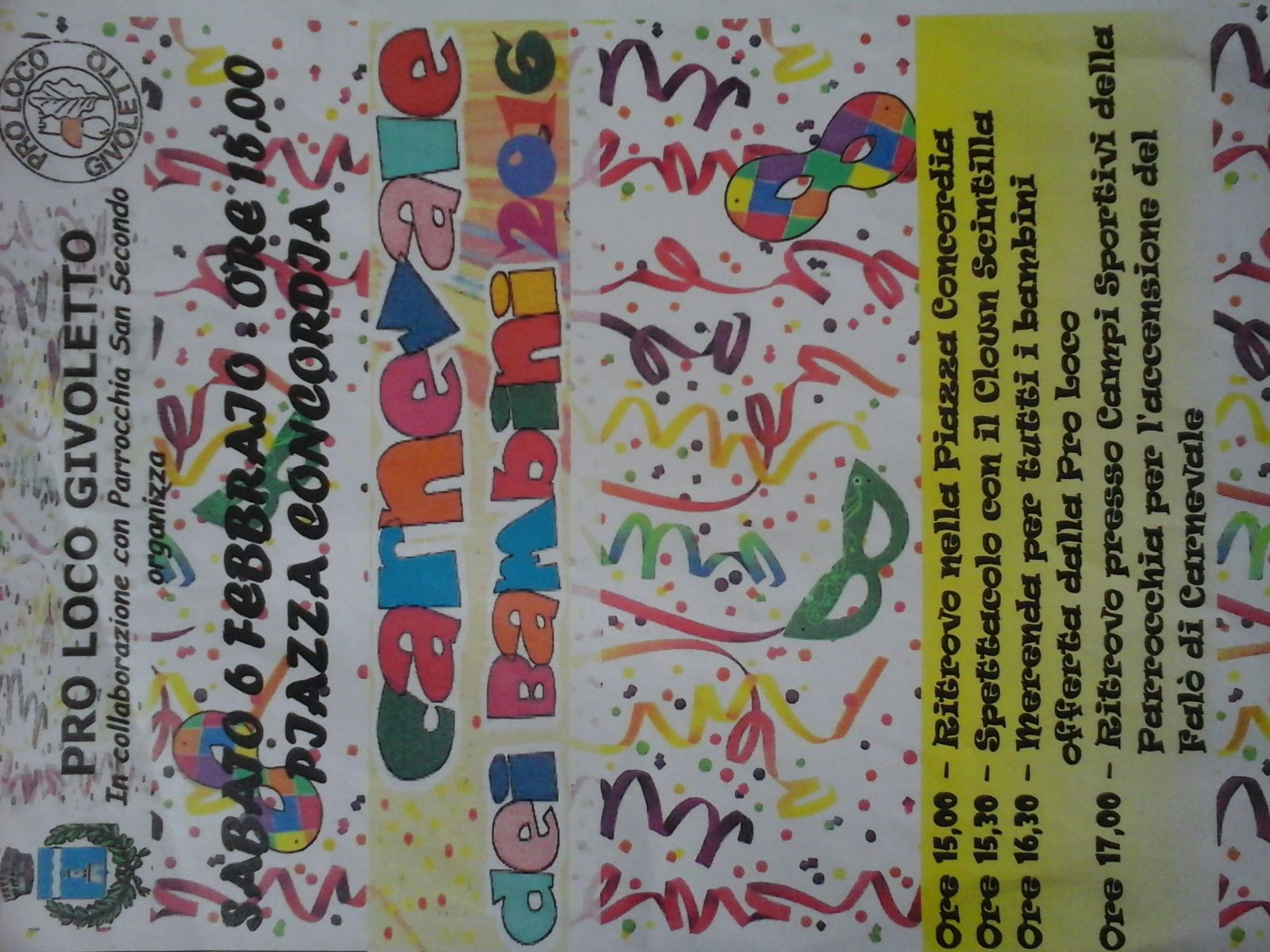 Sabato 6 Febbraio dalle ore 15.00 in Piazza della Concordia a Givoletto, la Pro Loco, in collaborazione con la Parrocchia di San Secondo, organizza il "carnevale dei bambini" (all'interno del salone polivalente in caso di maltempo)