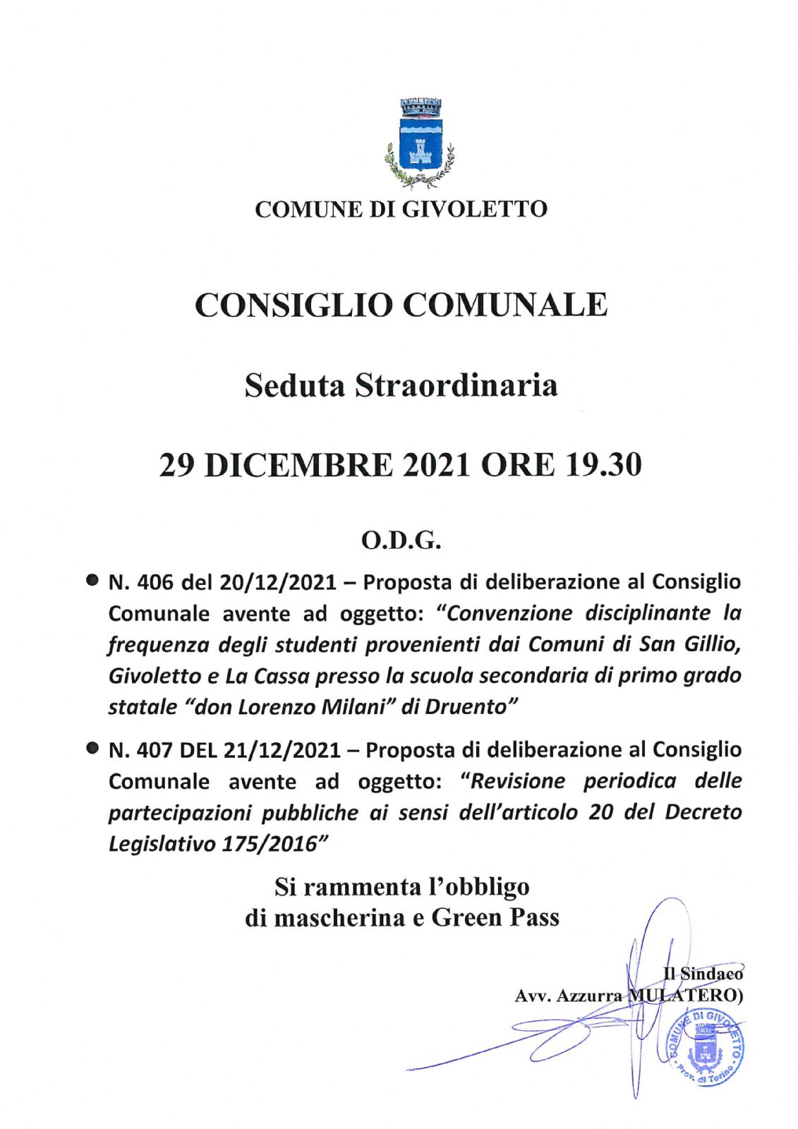 Per il giorno mercoledì 29 dicembre 2021 alle ore 19.30 è stata convocata una seduta straordinaria del Consiglio Comunale.