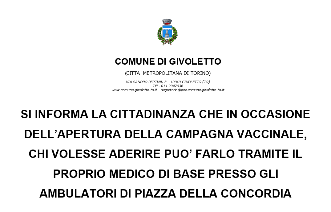 Si informa la cittadinanza che in occasione dell'apertura della campagna vaccinale, chi volesse aderire può farlo tramite il proprio medico di base presso gli ambulatori di Piazza della Concordia.