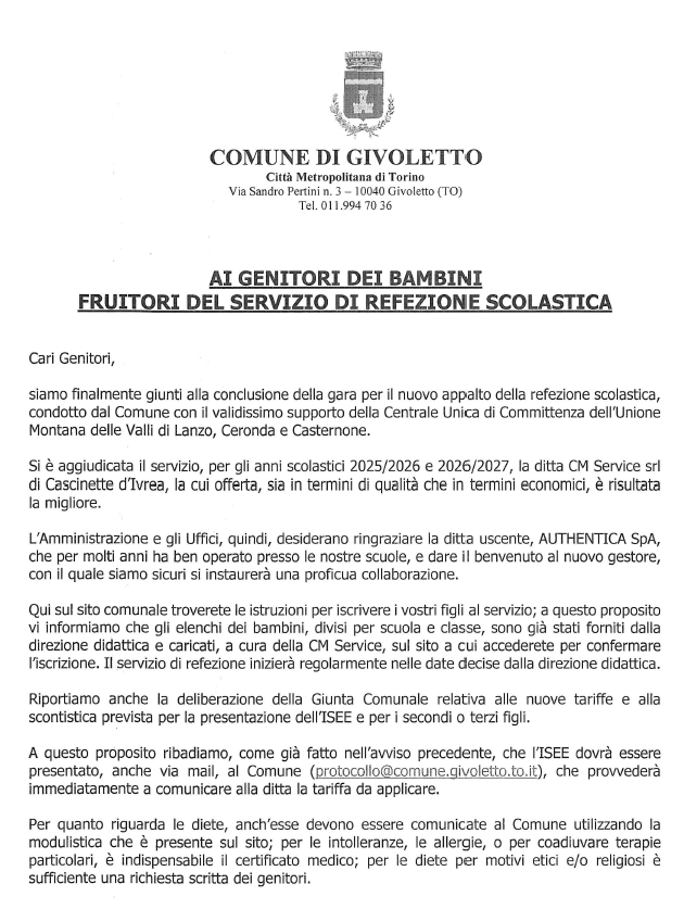 Si avvisa la cittadinanza interessata di consultare la documentazione allegata inerente al servizio di refezione per l'anno scolastico 2025/2026.