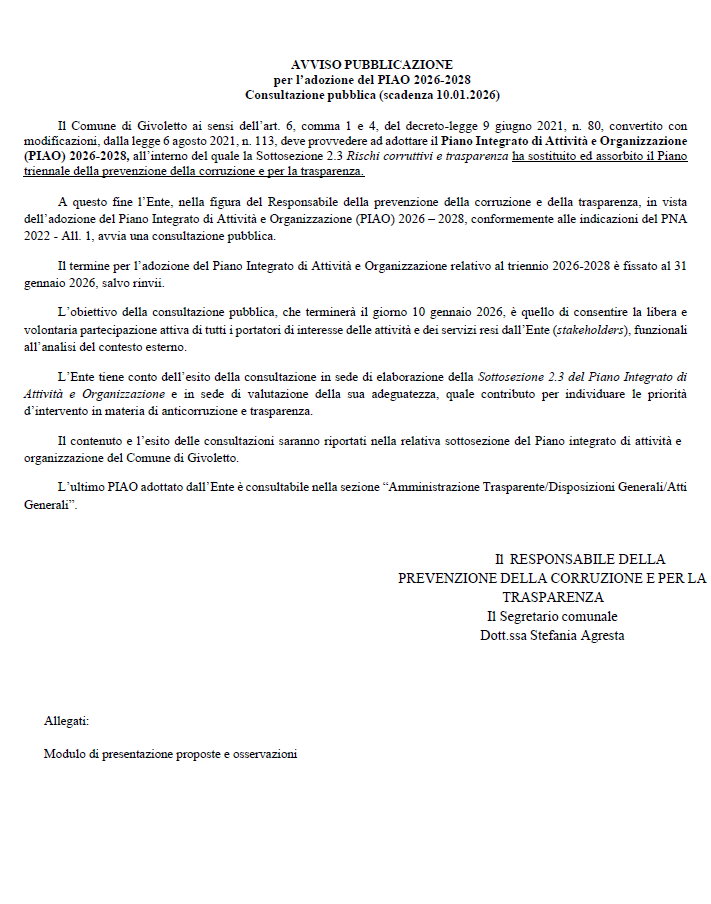 Il Comune di Givoletto ai sensi dell’art. 6, comma 1 e 4, del decreto-legge 9 giugno 2021, n. 80, convertito con modificazioni, dalla legge 6 agosto 2021, n. 113, deve provvedere ad adottare il Piano Integrato di Attività e Organizzazione (PIAO) 2026-2028, all’interno del quale la Sottosezione 2.3 Rischi corruttivi e trasparenza ha sostituito ed assorbito il Piano triennale della prevenzione della corruzione e per la trasparenza.