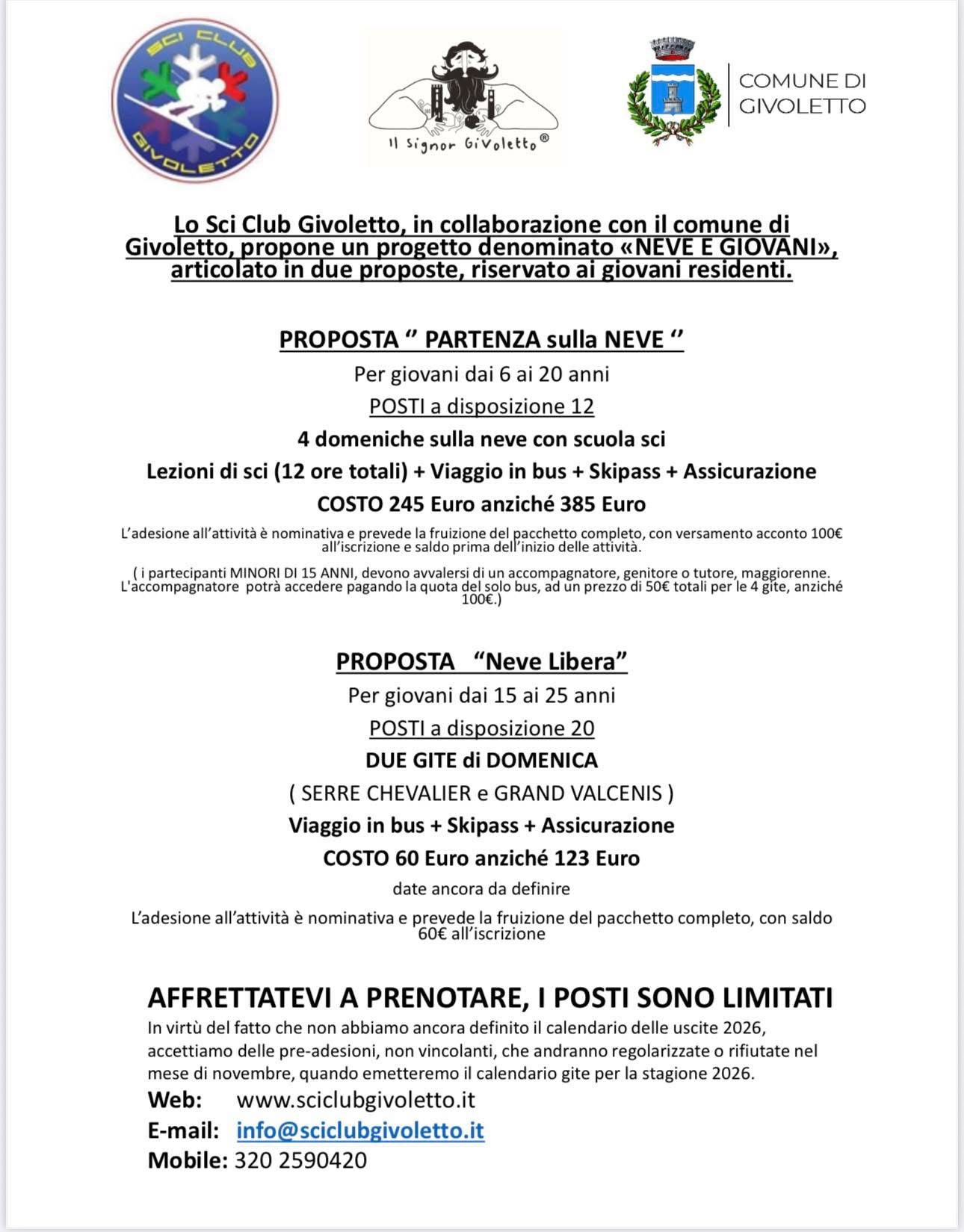 Lo Sci Club di Givoletto, in collaborazione con il Comune di Givoletto, propone un progetto denominato "Neve e Giovani", articolato in due proposte e riservato ai giovani residenti.