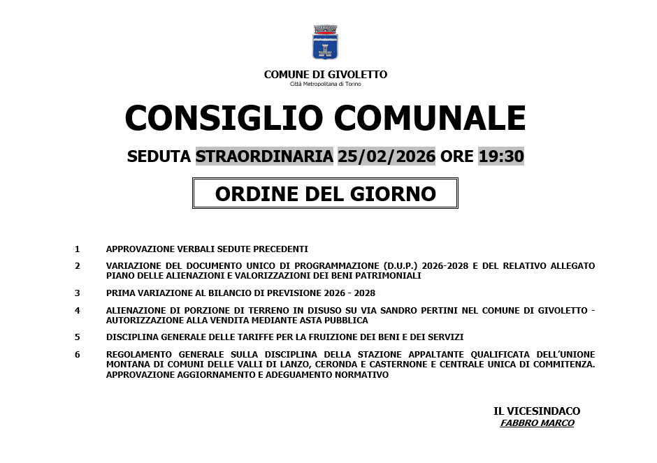 Convocazione del Consiglio Comunale del 25 febbraio 2026