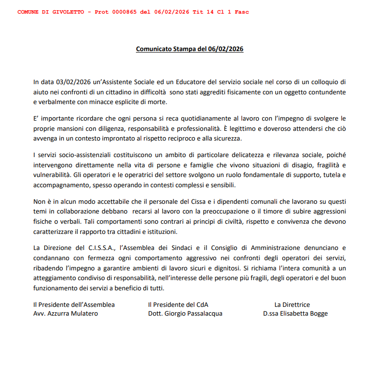 Si avvisa la cittadinanza del Comunicato stampa rilasciato dal CISSA di Pianezza per segnalare un nuovo e riprovevole caso di aggressione ai danni di un'Assistente Sociale ed un Educatore del servizio sociale.