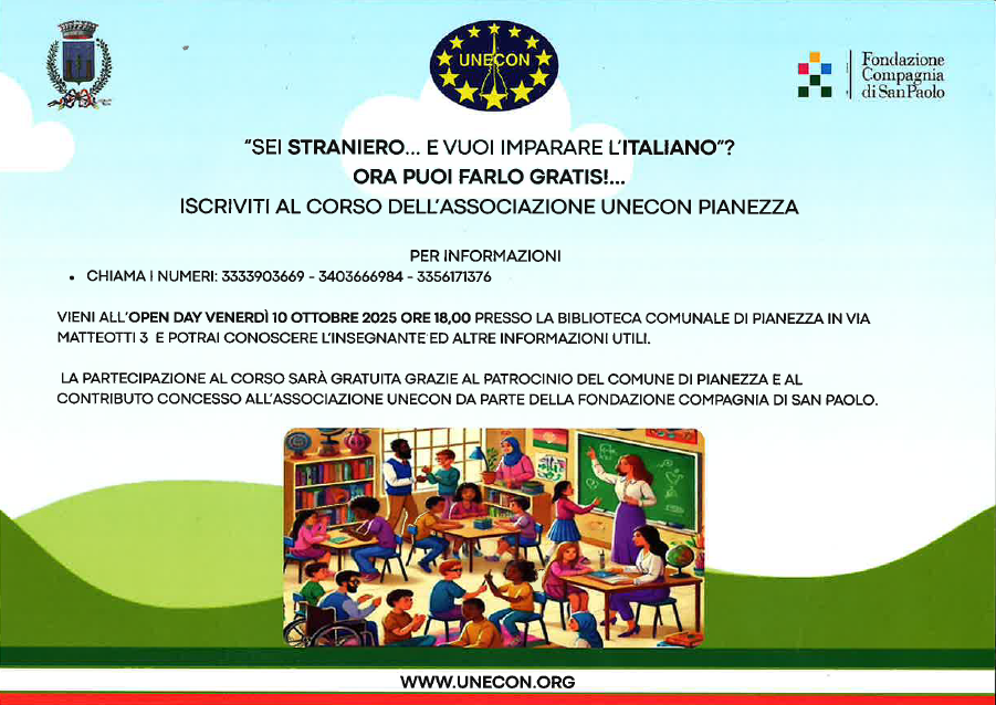 Si informano tutti i cittadini stranieri che l'associazione UNECON di Pianezza offre gratuitamente un corso di italiano per gli stranieri.