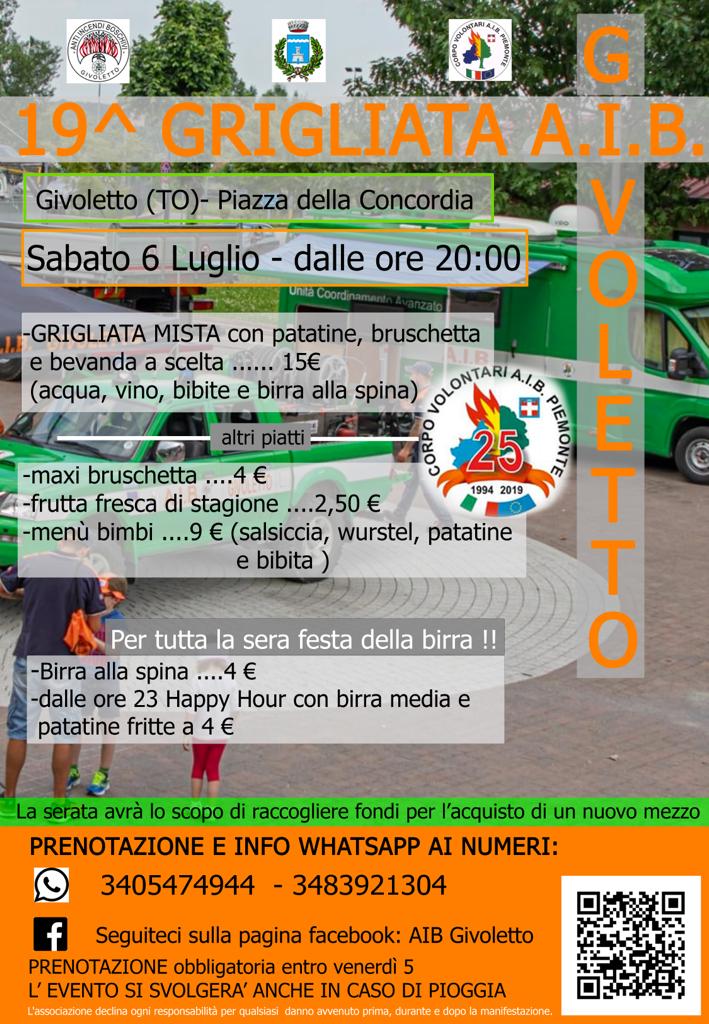 Sabato 6 Luglio dalle ore 20.00 presso Piazza della Concordia, l'A.I.B. Givoletto organizza una cena a base di grigliata mista. Il ricavato servirà per l’acquisto di un nuovo mezzo dell’AIB. L’evento si terrà anche in caso di pioggia.