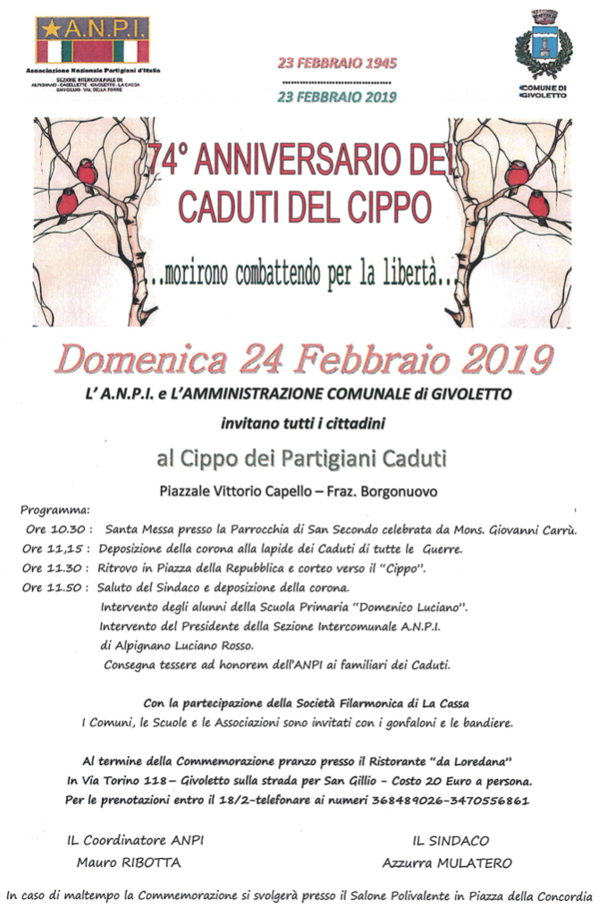 L'A.N.P.I. e l''Amministrazione Comunale di Givoletto, invitano tutti i Cittadini, Domenica 24 febbraio 2019 al Cippo dei Partigiani Caduti, Piazzale Vittorio Capello- Fraz. Borgonuovo per commemorare il 74°ANNIVERSARIO DEI CADUTI DEL CIPPO (in caso di maltempo, l'evento si terrà presso il Salone Polivalente, Piazza della Concordia)