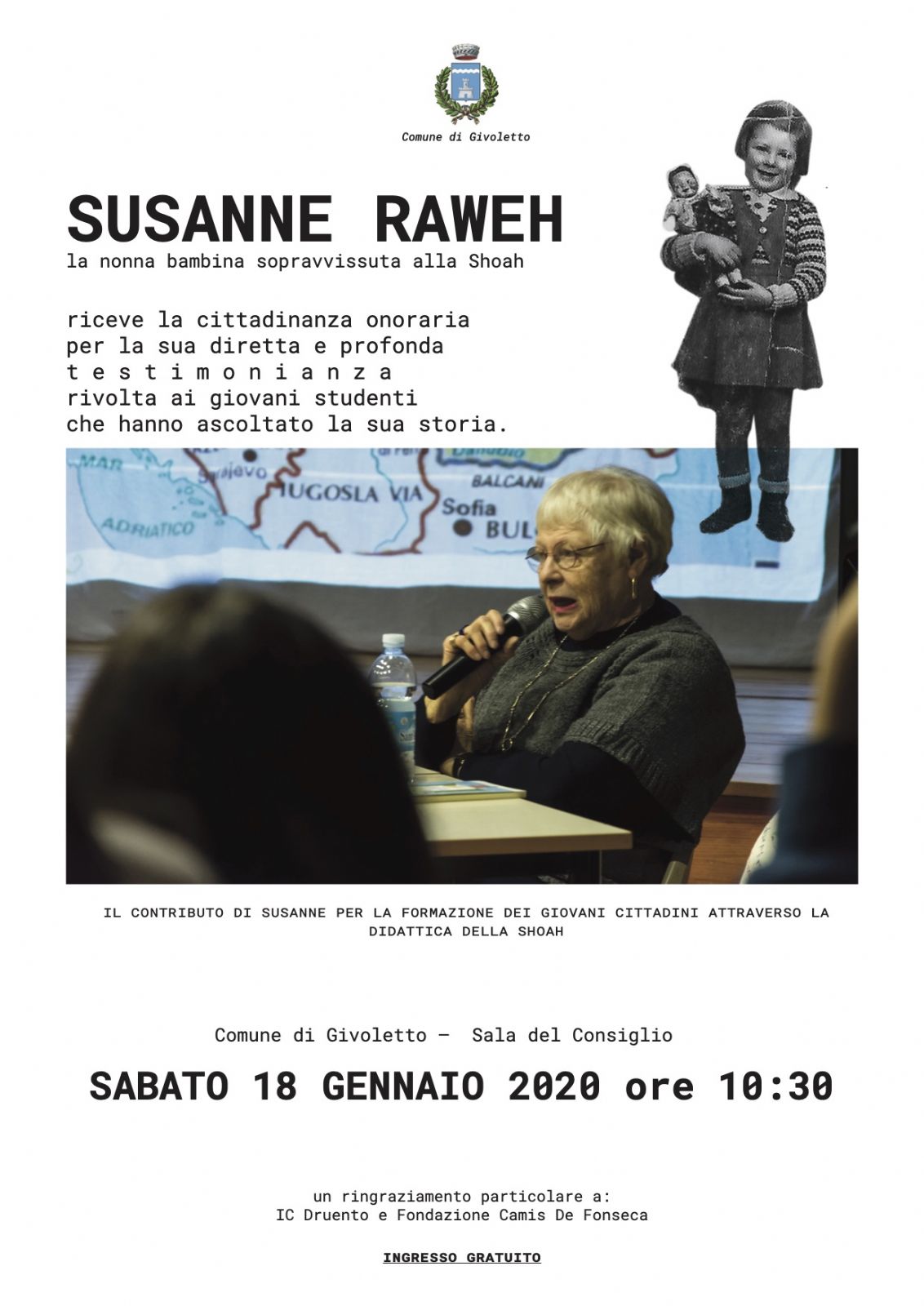 Sabato 18 Gennaio alle ore 10.30 presso la Sala Consigliare del Comune di Givoletto, la signora Susanne Raweh, la nonna bambina sopravvissuta alla Shoah, riceverà la cittadinanza onoraria per la sua diretta e profonda testimonianza rivolta ai giovani studenti che hanno ascoltato la sua storia.