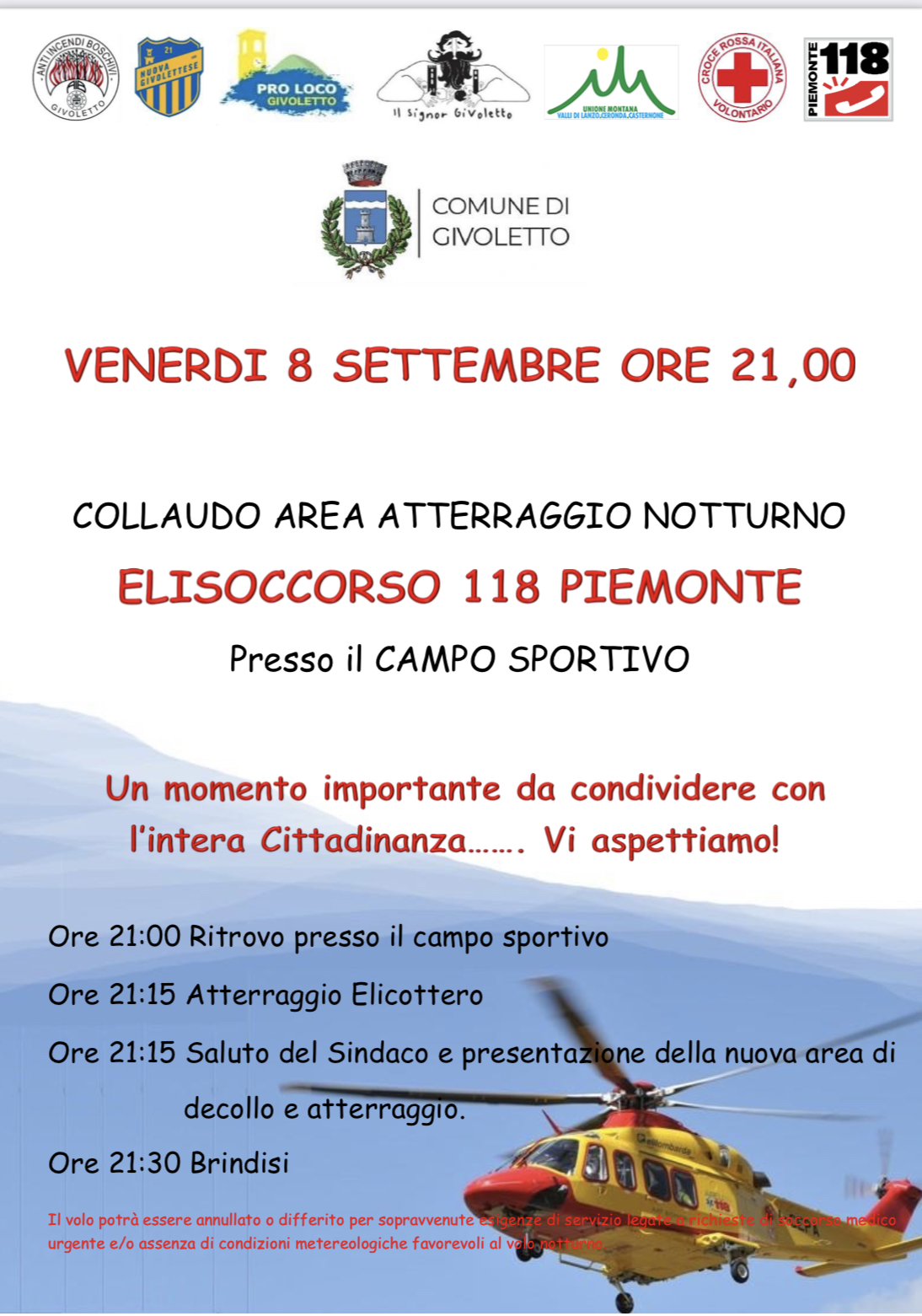 Venerdi' 8 Settembre alle ore 21.00 presso il campo sportivo, verrà eseguita la prova di collaudo e d inaugurazione dell'area di atterraggio notturno dell'elisoccorso. Siete tutti invitati a partecipare.