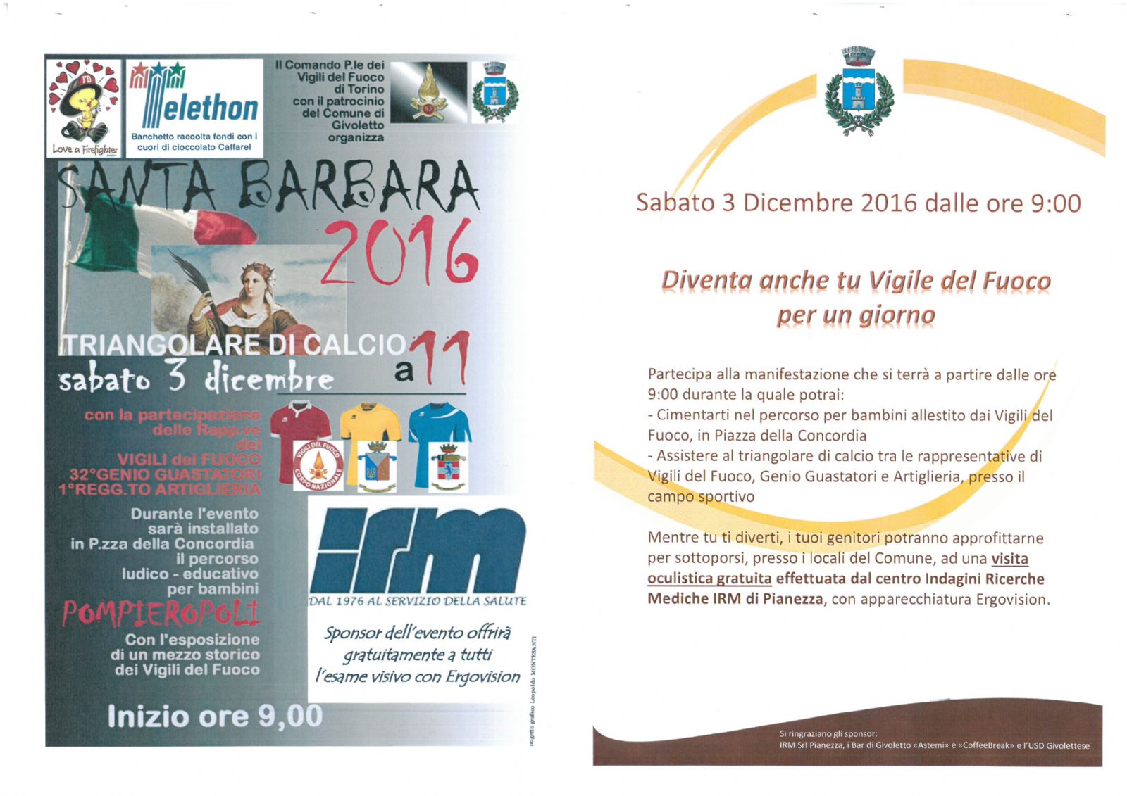 In occasione della ricorrenza di Santa Barbara, Sabato 3 Dicembre a partire dalle ore 9.00, verrà organizzato, presso piazza della Concordia, 'Pompieropoli', un percorso per bambini allestito dai Vigili del Fuoco. Contemporaneamente all'evento, presso il campo sportivo, si svolgerà un triangolare di calcio tra le rappresentative di Vigili del Fuoco, Genio Guastatori e Artiglieria.
