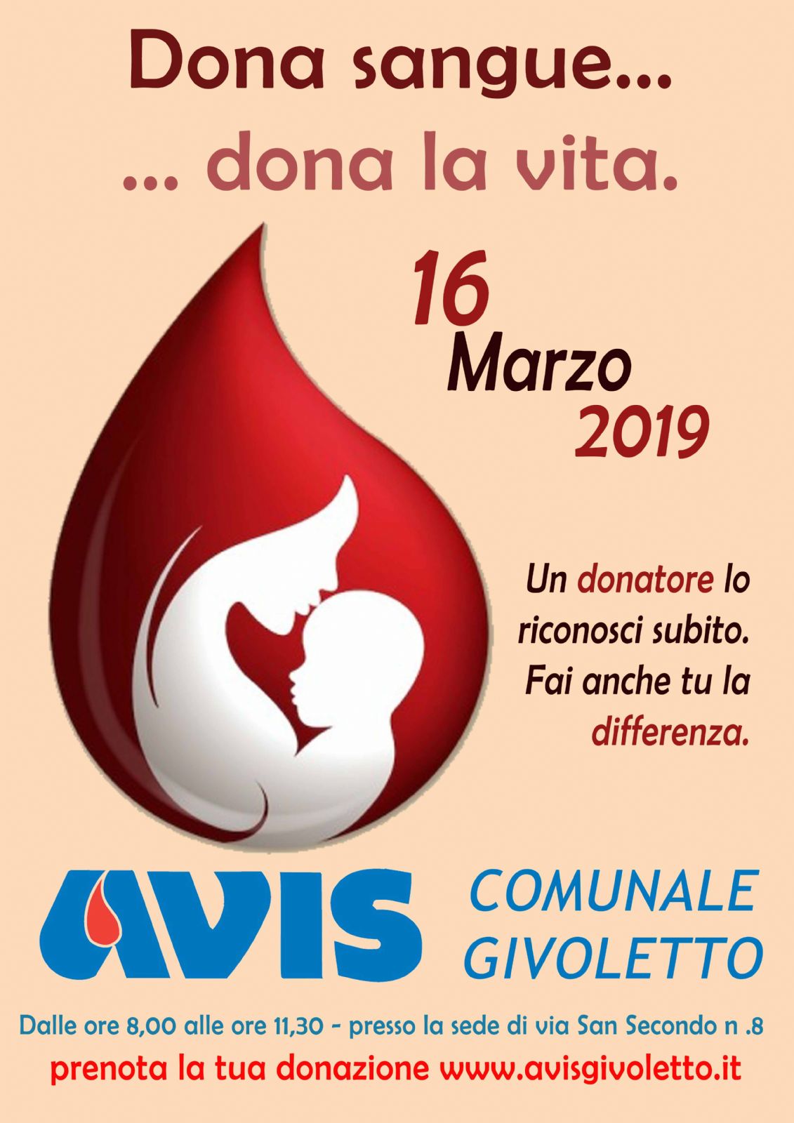 Sabato 16 Marzo dalle ore 8.00 alle ore 11.30 presso la sede Avis Givoletto, Via San Secondo 8, chi vuole può partecipare con una donazione alla raccolta sangue. Vi è anche la possibilità di prenotare la donazione attraverso il link: www.avisgivoletto.it