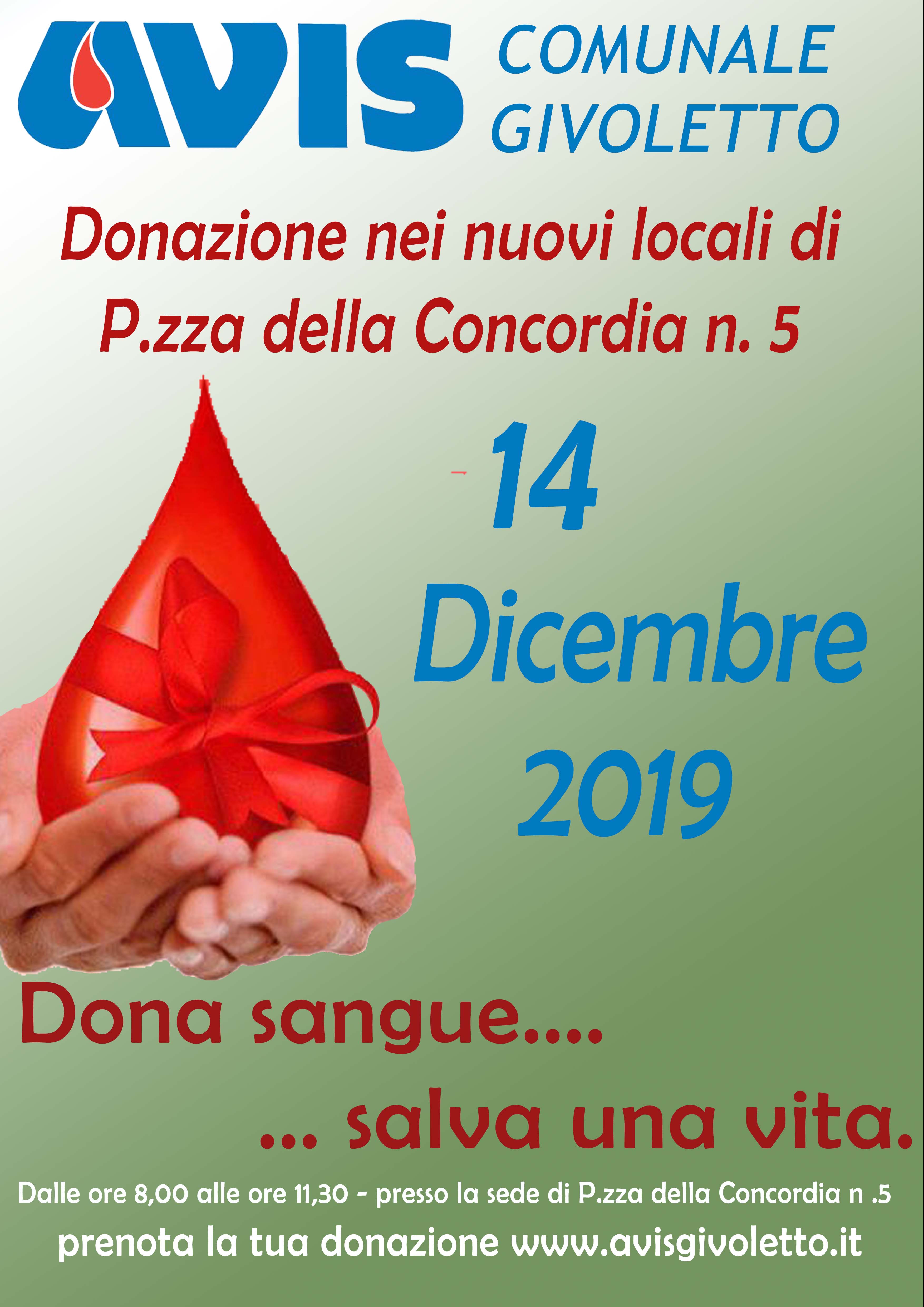 Sabato 14 Dicembre dalle ore 8.00 alle ore 11.30 presso la NUOVA sede Avis Givoletto, Piazza della Concordia 5, chi vuole può partecipare con una donazione alla raccolta sangue. Vi è anche la possibilità di prenotare la donazione attraverso il link: www.avisgivoletto.it
