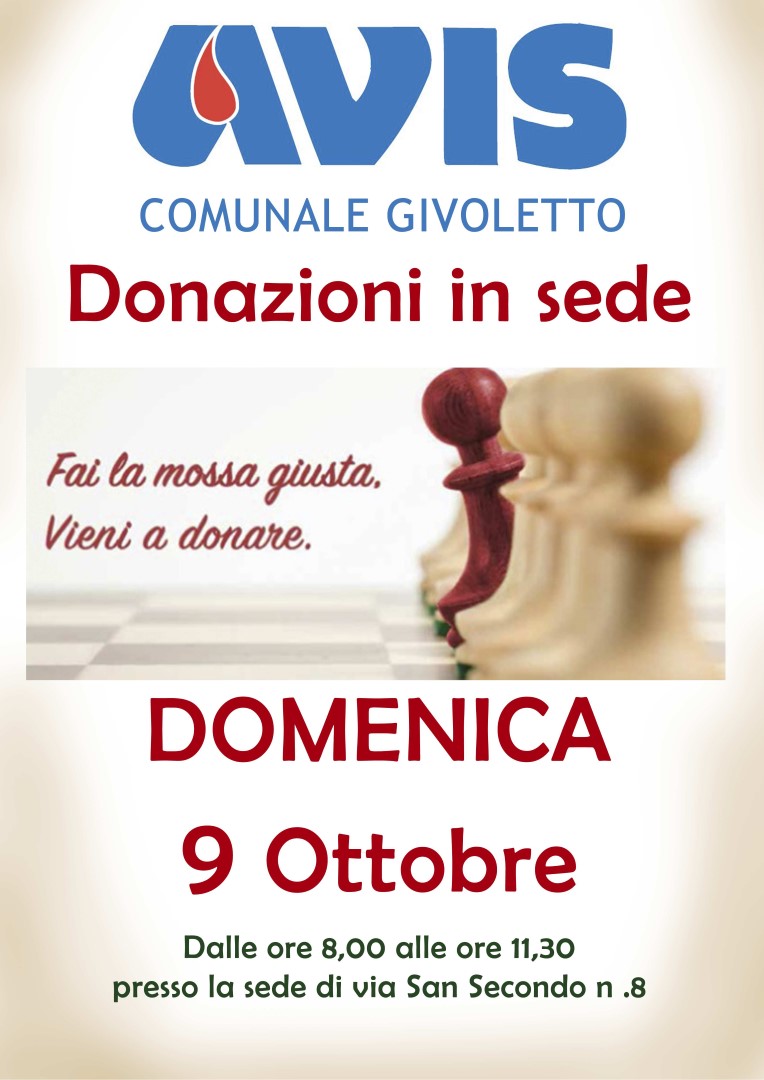 Il giorno 9 Ottobre dalle ore 8.00 alle ore 11.30 presso la sede dell'AVIS Givoletto, in via San Secondo n. 8 sarà possibile effettuare una donazione di sangue.