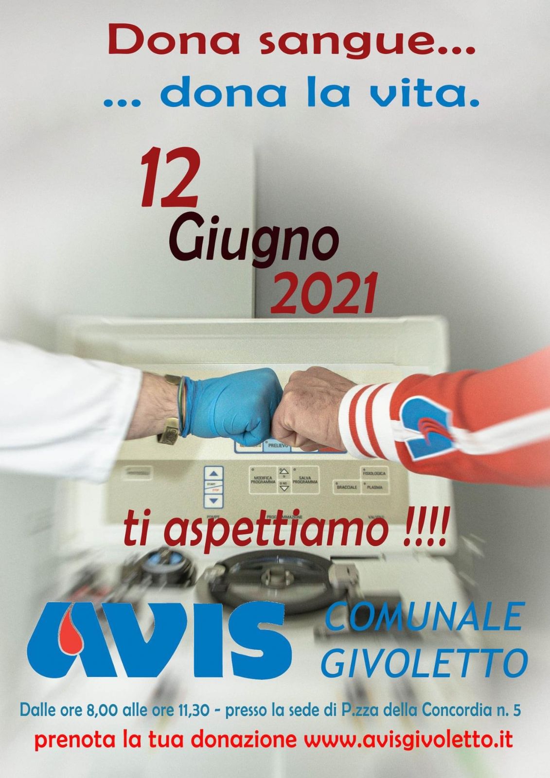 Sabato 12 Giugno dalle ore 8.00 alle ore 11.30 presso la sede Avis Givoletto, Piazza della Concordia 5, chi vuole può partecipare con una donazione alla raccolta sangue. Vi è anche la possibilità di prenotare la donazione attraverso il link: Avis Givoletto