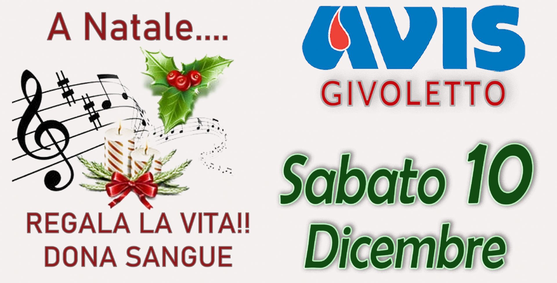 Sabato 10 Dicembre dalle ore 8.00 alle ore 11.30 presso la sede Avis Givoletto, Piazza della Concordia 5, chi vuole può partecipare con una donazione alla raccolta sangue. Vi è anche la possibilità di prenotare la donazione attraverso il link: Avis Givoletto