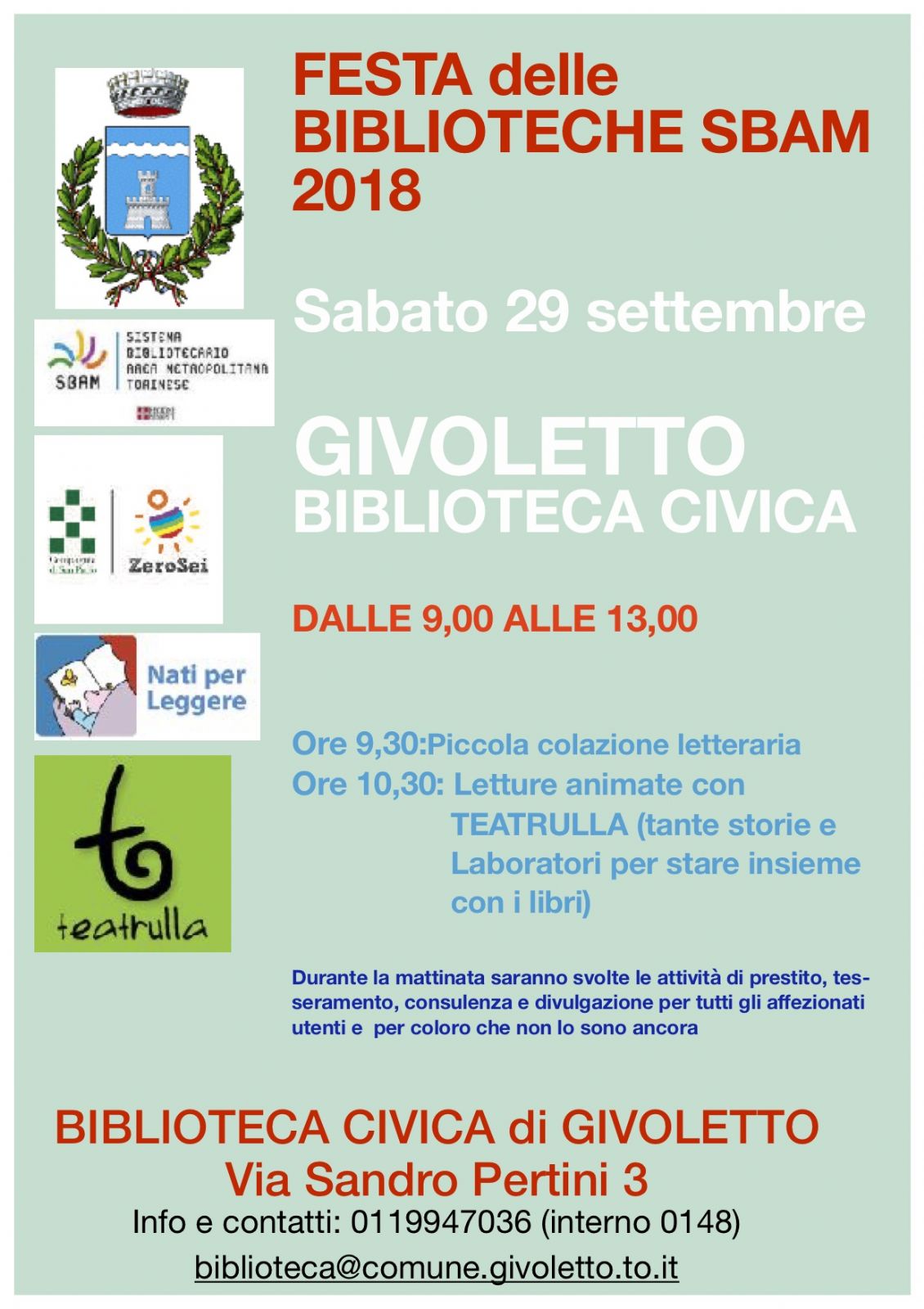 Sabato 29 Settembre dalle ore 9.00 alle ore 13.00, presso la Biblioteca Civica, si svolgerà la festa della biblioteche Sbam. Alle ore 9.30 si inizierà una piccola colazione letteraria per poi proseguire alle ore 10.30 con le letture animate con Teatrulla.
